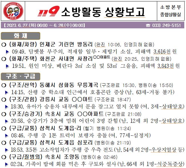 119 소방활동 일일상황보고(6.28.수) 06:00