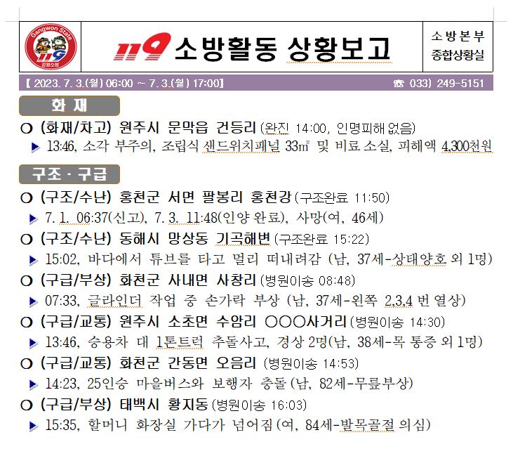 119 소방활동 일일상황보고(7. 3. 월) 17:00