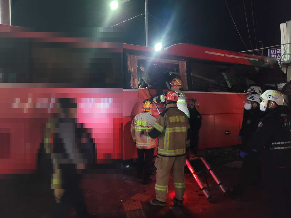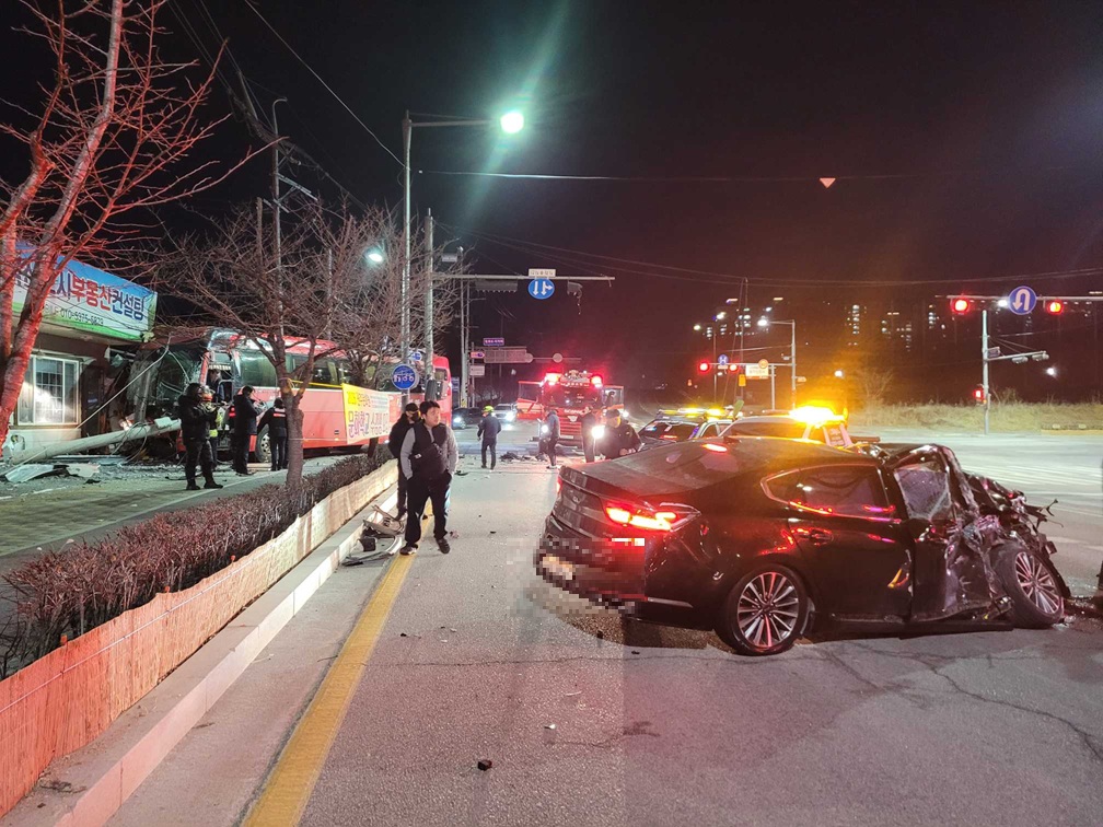 내용: 출퇴근 전세버스가 K7과 1차 충돌 후 2차 전신주 충격한 사고임