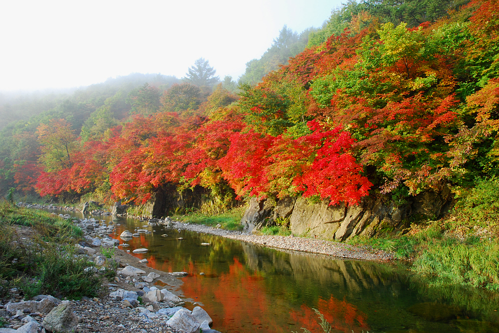 안개와 단풍이 절정입니다.