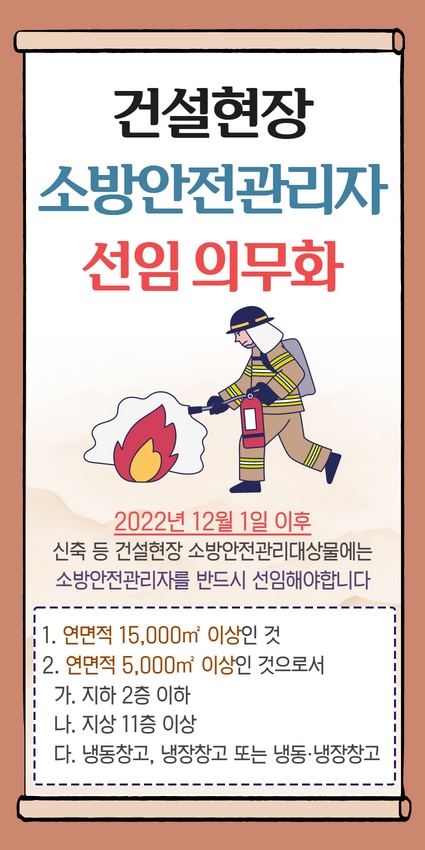 | 26729 | 건설현장 소방안전관리자 선임 의무화 안내(시행 : 2022.12.1.) | 춘천홍보 | 2022-10-06 | 2325 | |