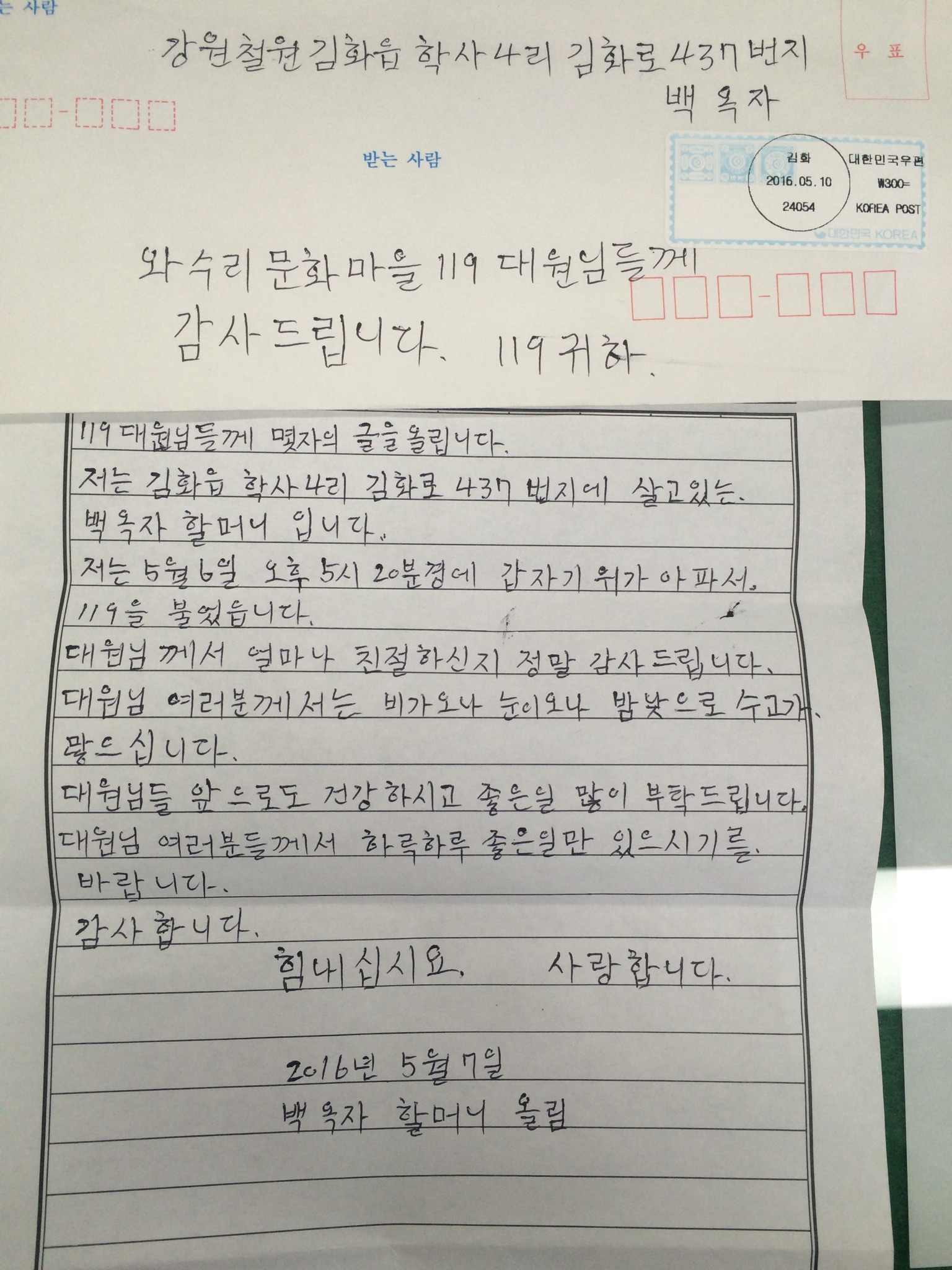 김화119안전센터로 한통의 편지가 찾아왔습니다
