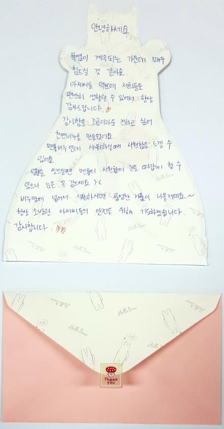 강원도 소방본부 환동해특수재난대응단에서 8.3(금) 구조전술 훈련을 하고 있는데 한 여학생이 와서 감사의 편지와 비누를 전달해줘서 소개해드립니다. " 편지랑 비누 너무 고마워요~ 잘 씻을께요~ "