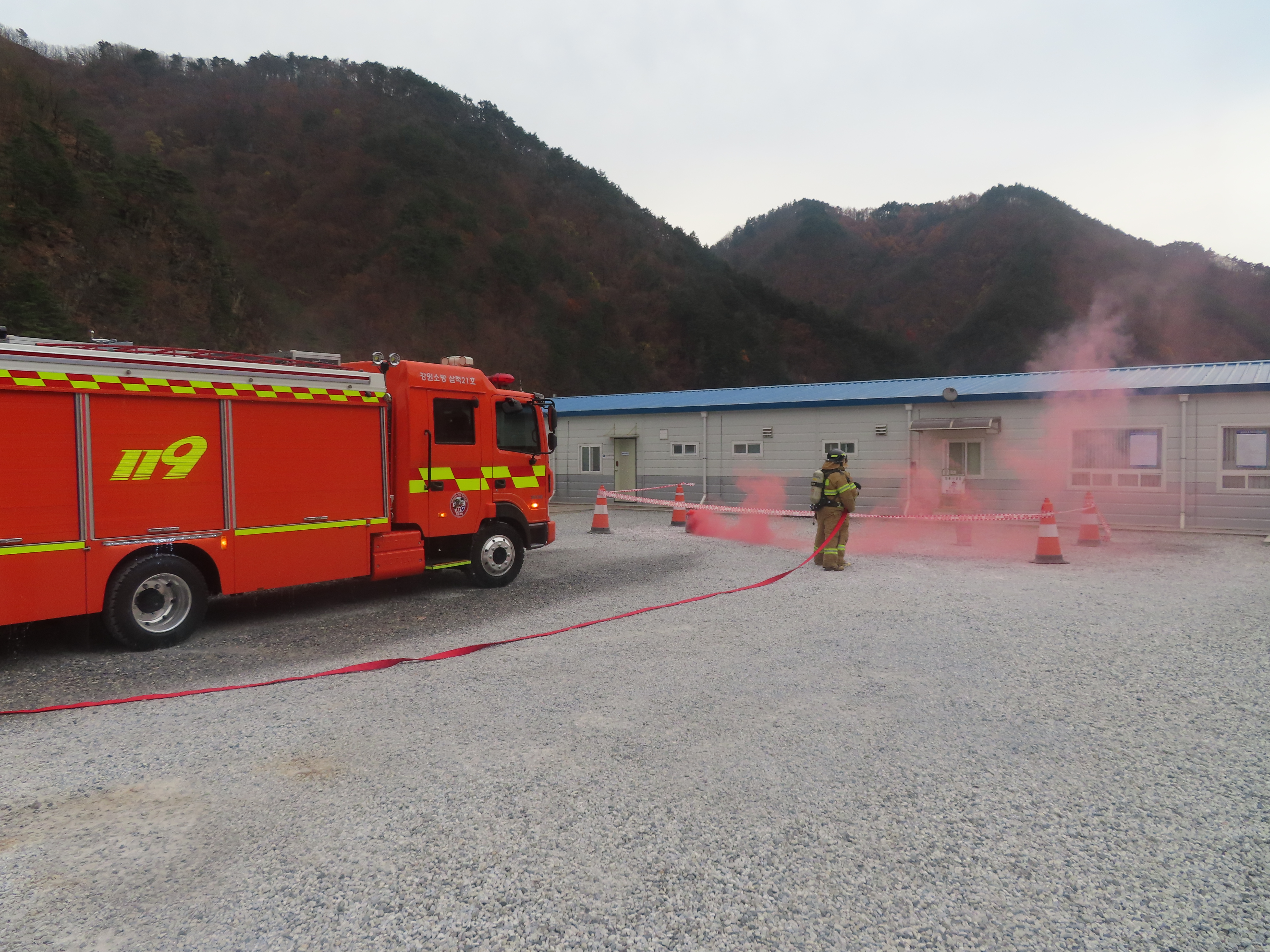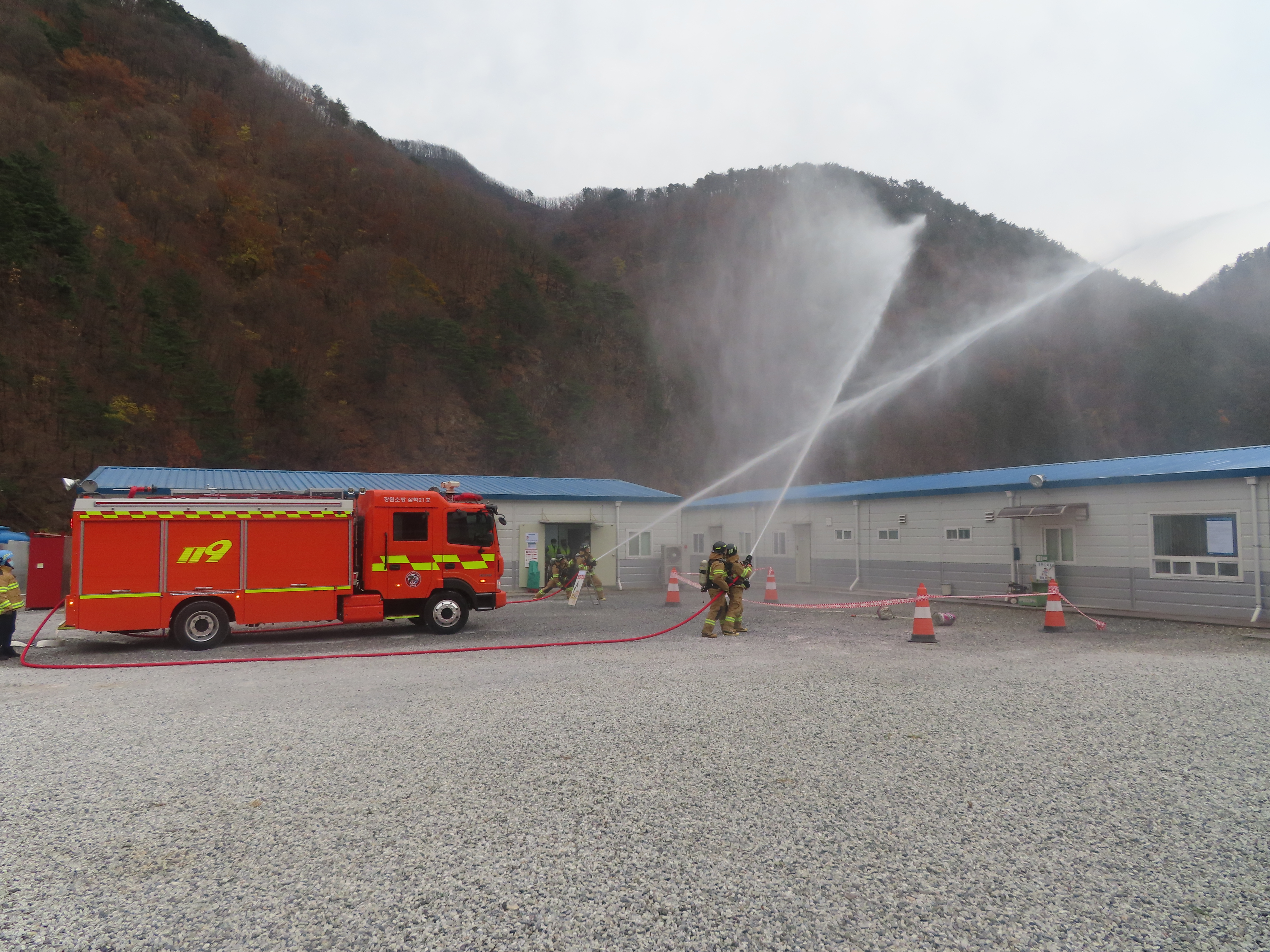 당 현장은 삼척에서 태백에 이르는 광범위한 산악지형에서 공사를 수행하는 현장으로써 대부분의 작업이 산속에서 진행 되어 평소 화재 및 재난 대응에 취약한 현장 이었습니다.