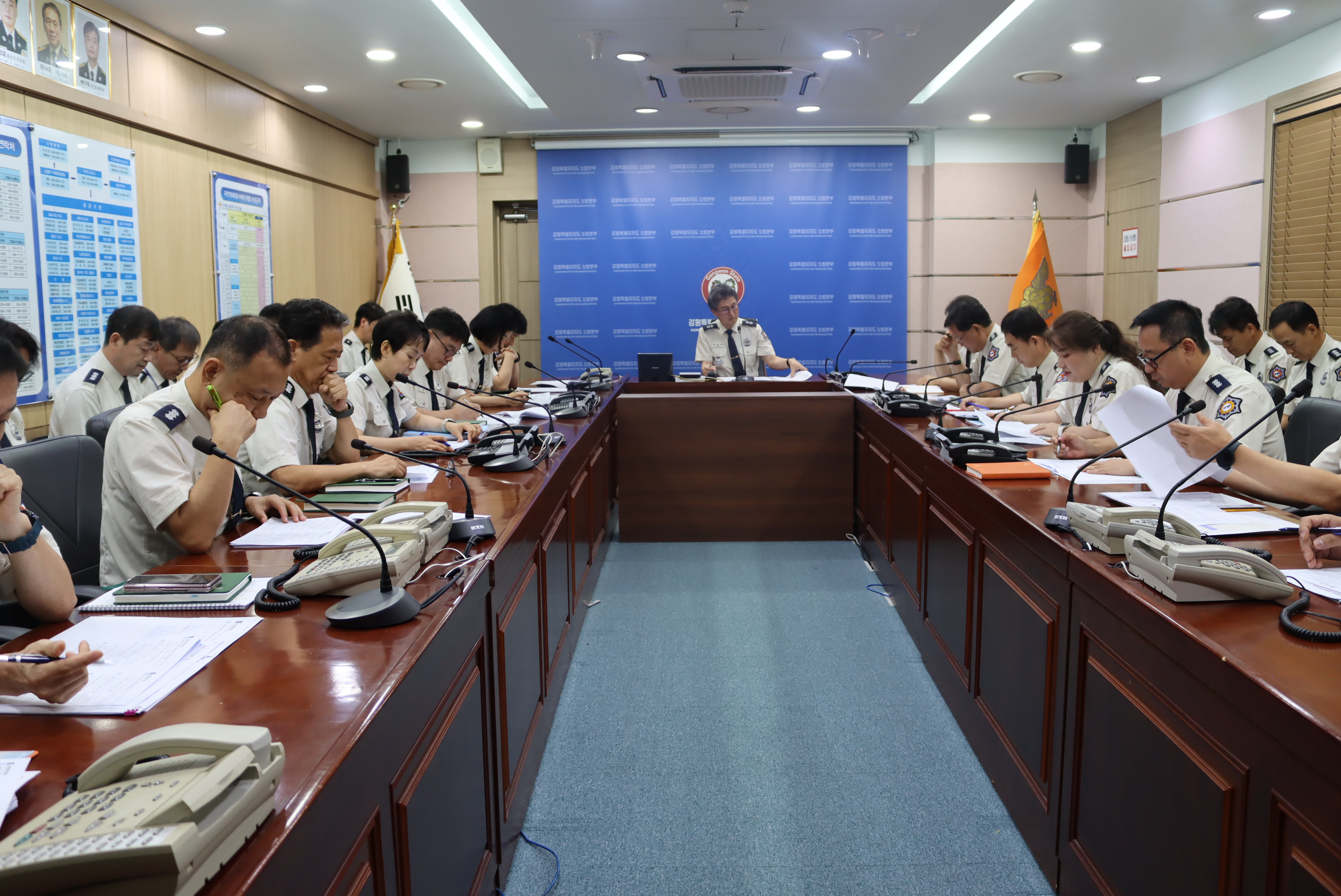 〇 강원특별자치도 소방본부(본부장 김승룡)는 27일 본부장 주재로 도청 전략회의실에서 가을철 소방안전대책 추진을 위한 확대간부회의를 실시했다. 이번 대책은 추석연휴(10.3.~10.9.)와 가을철(9~10월) 산악활동 증가에 대비해 화재와 산악사고 위험을 미리 차단하고 도민 안전을 확보하기 위해 마련됐다.