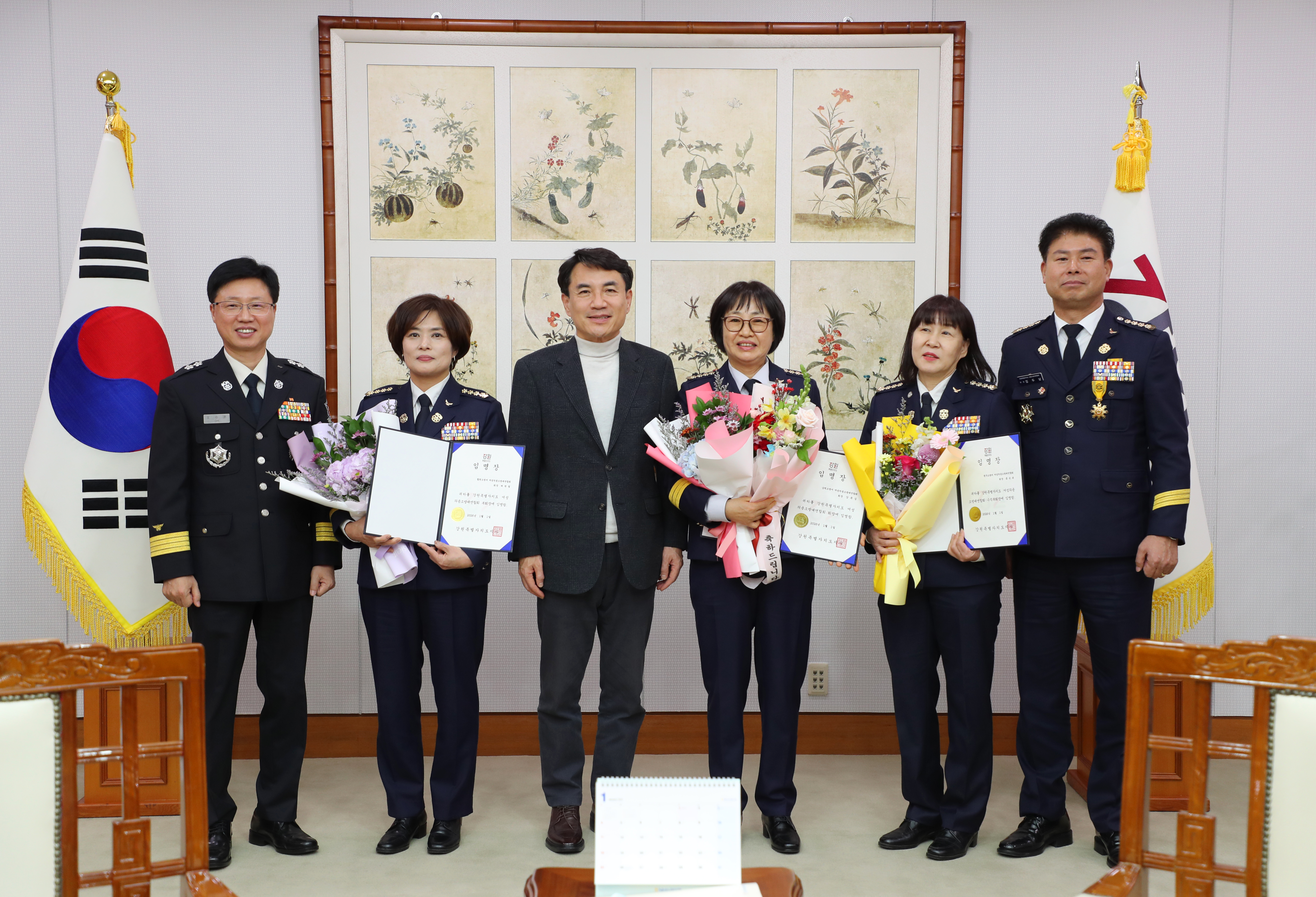 ○ 강원특별자치도 소방본부(본부장 오승훈)는 9일 도청 통상상담실에서 김진태 도지사가 참석한 가운데 신임 여성의용소방대연합회 임원 임명장 수여식을 개최했다.