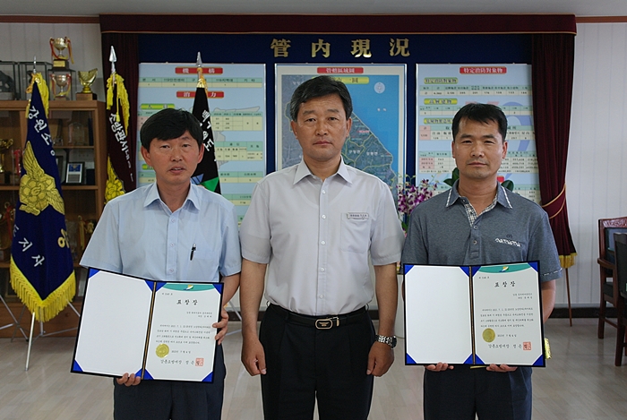 강릉소방서(서장 정은철)는 7월 4일(목) 09시 서장실에서 지난 7월 1일 강릉시 노암동 한라1차아파트 경로당 화재 시 위험을 무릅쓰고 옥내소화전을 이용한 초기 소화활동으로 연소확대 방지 및 재산피해를 최소화 하는데 공로가 있는 아파트 주민 강모씨(남.51)와 용모씨(남.46)에게 표창장을 수여하고 감사의 인사를 전하였습니다.