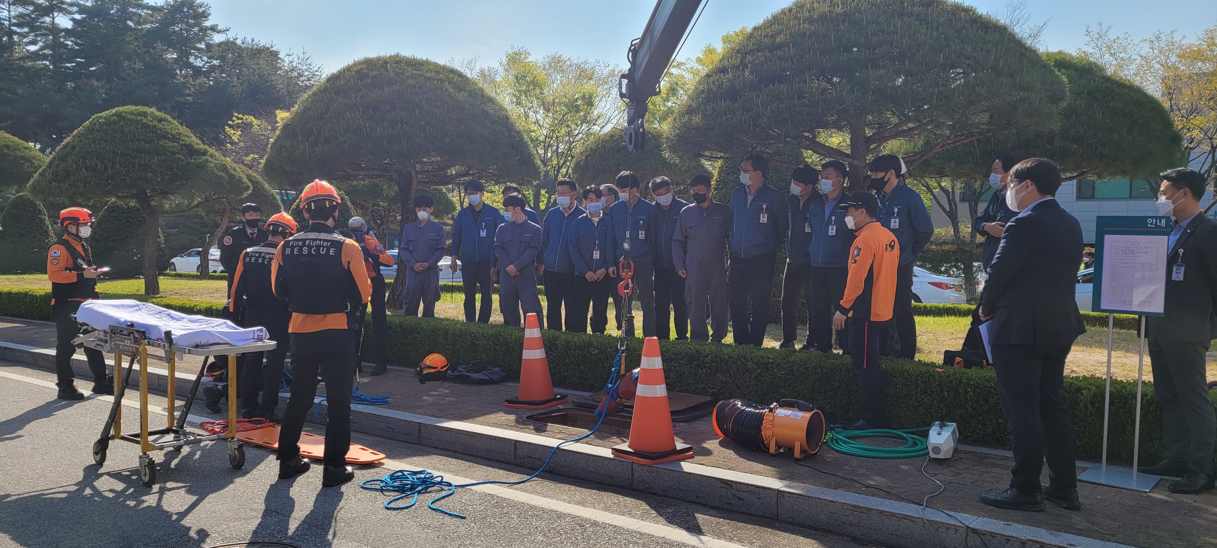소방서에서는 장비 3대와 인원 9명을 투입하여 밀폐공간 사고 구조훈련 지원 및 심폐소생술, 소화기 사용법 교육을 병행했다.