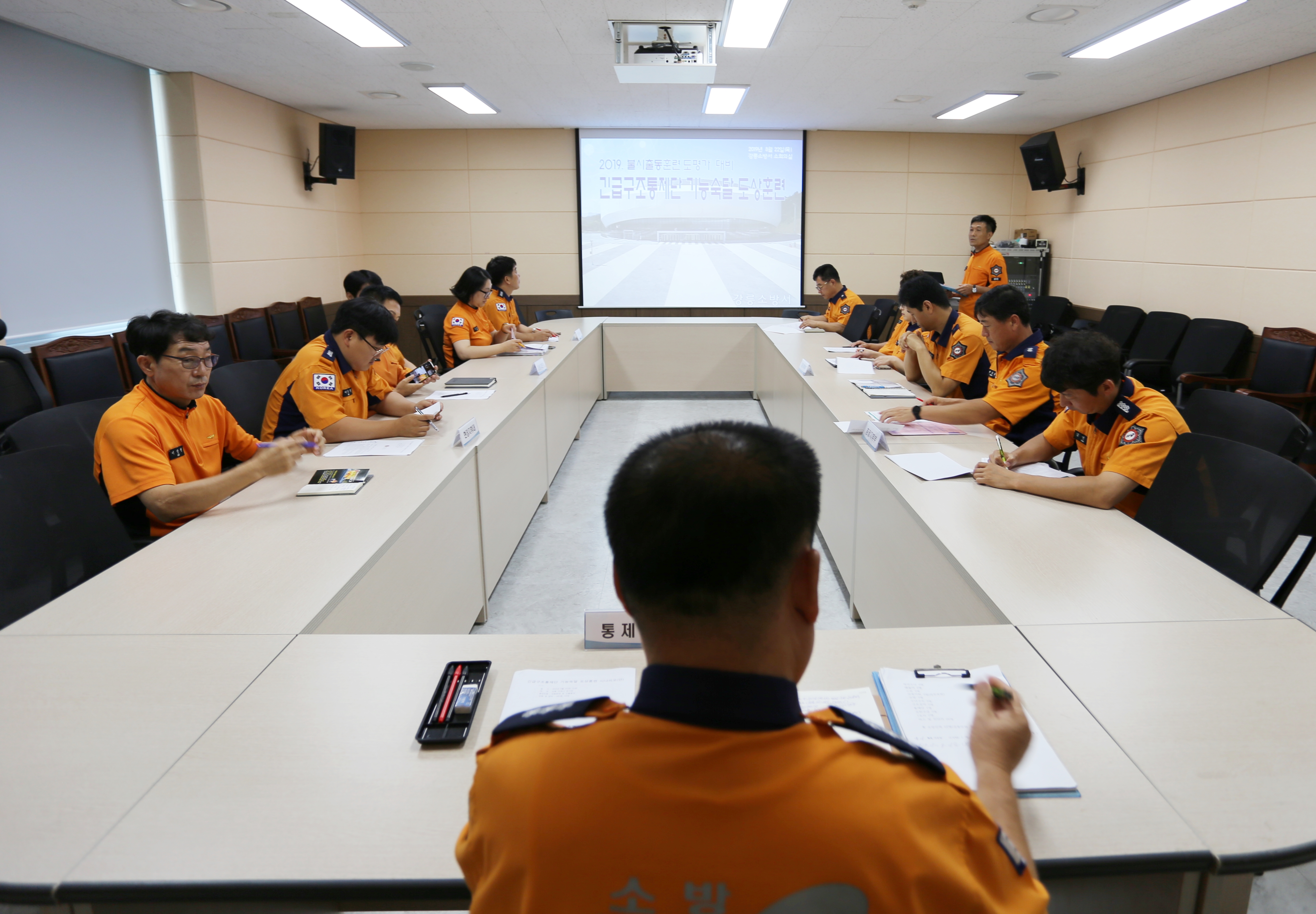 강릉소방서는 22일 오전 11시 기능별 임무숙지 등을 명확하게 이해하고 재난 발생 시 상황별 특성에 맞는 대응능력 향상을 위한 '긴급구조통제단 기능숙달 도상훈련'을 실시했다.