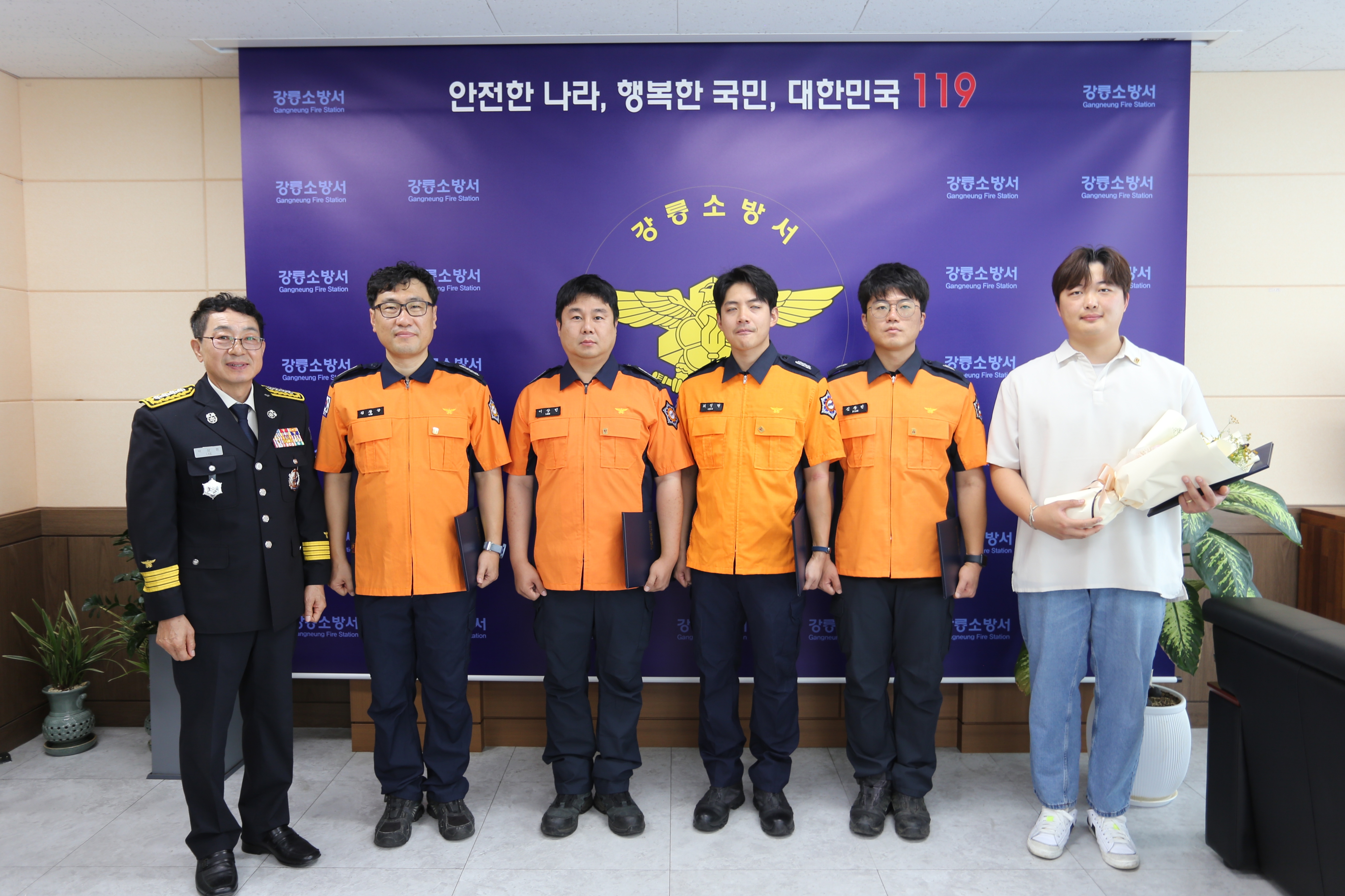 강릉소방서는 오늘 오전 9시 강릉소방서 서장실에서 신속한 응급처치로 중증환자의 소생 및 회복에 크게 기여한 구급대원 4명, 일반인 1명에게 하트세이버 인증서를 수여했습니다.