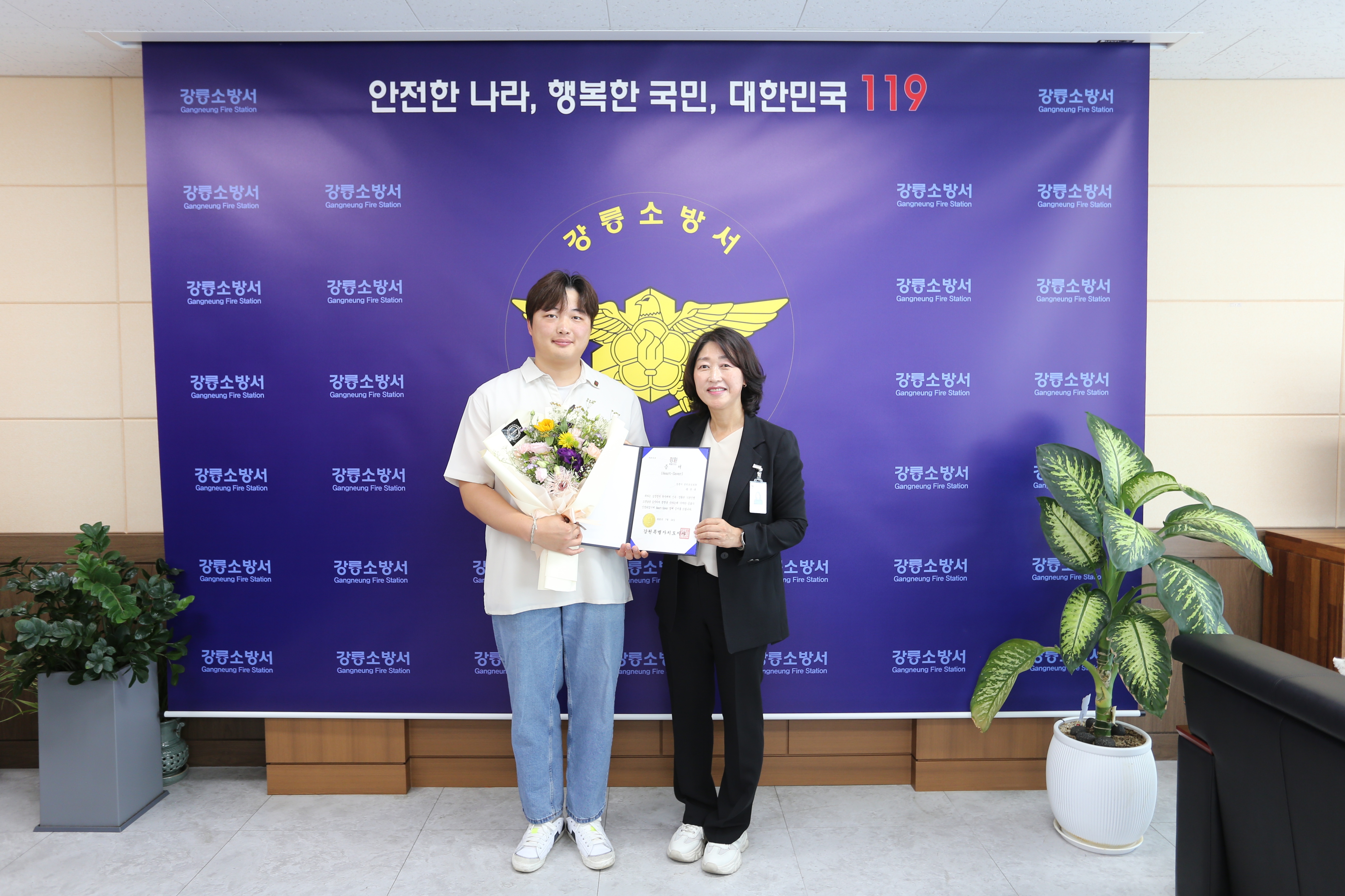 이날 수여식에는 강릉시청 김선희 행정지원과장이 참석하였으며, 하트세이버로 선정된 대원은 ▲소방장 김창규 ▲소방장 이상민 ▲소방교 최정현 ▲소방사 김창빈이 선정됐으며, 일반인은 ▲강릉시 소속 청원경찰 곽선규님이 선정되었습니다!