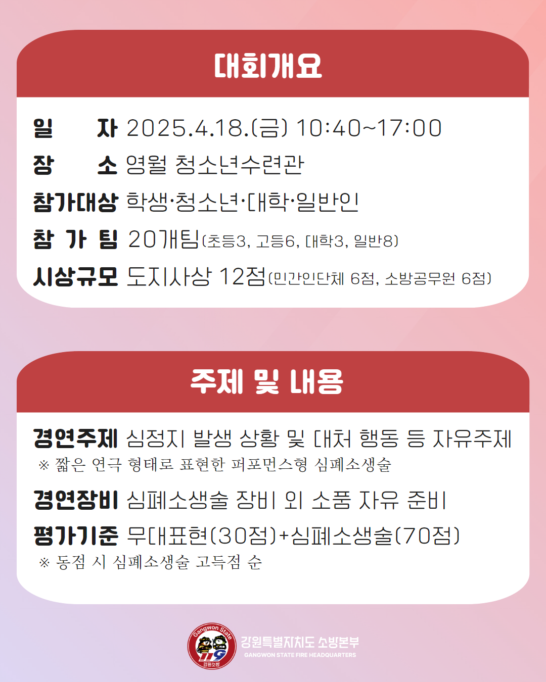 제7회 강원특별자치도 일반인 심폐소생술 경연대회가 4.18.(금) 영월 청소년수련관에서 열립니다!