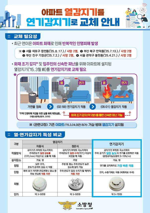 아파트 열감지기를 연기감지기로 교체해 주세요!