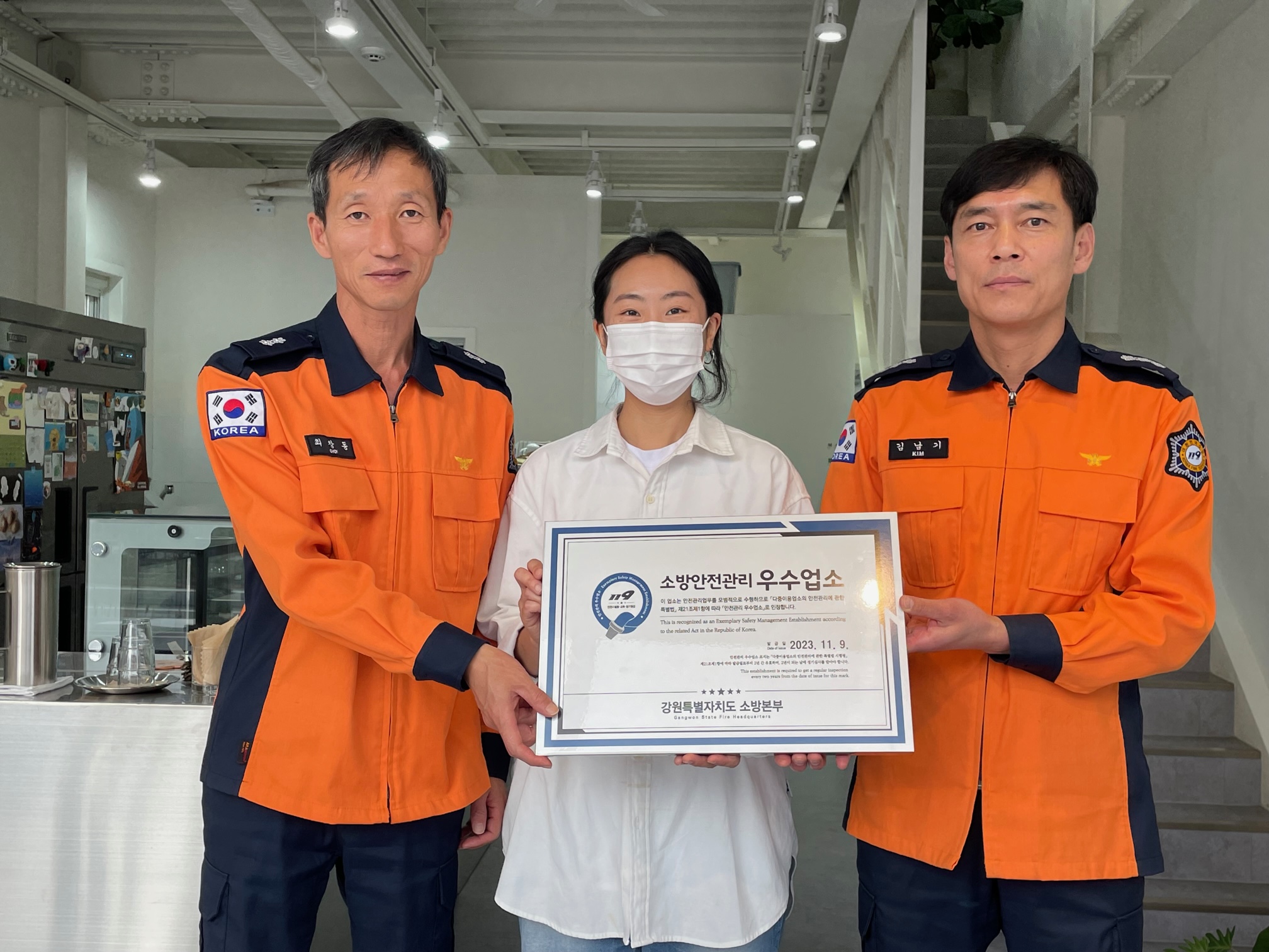 죽왕면에 위치한 ‘고성빵가’를 2023년도 다중이용업소 안전관리 우수업소로 선정하고 인증표지 현판식을 가졌습니다.
