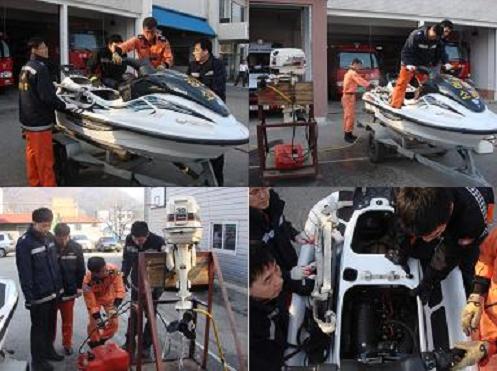 제트스키 및 고무보트 엔진 외관을 닦고 시동점검 등 수난사고에 조그마한 부족함이 없도록