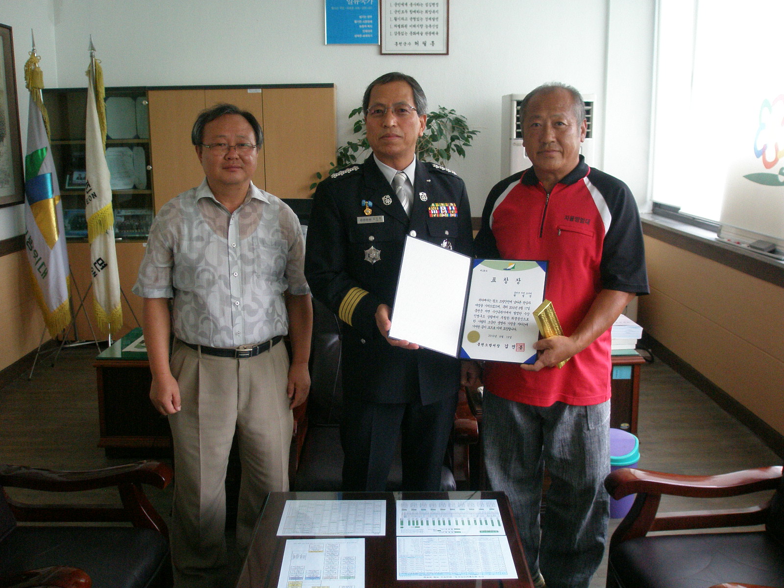 홍천소방서(서장 김진봉)는 8월19일(목)10:00 홍천서면사무소에서 수상인명구조에 공을 세운 원성진(남,58세)씨에게 표창장을 전달하였다.