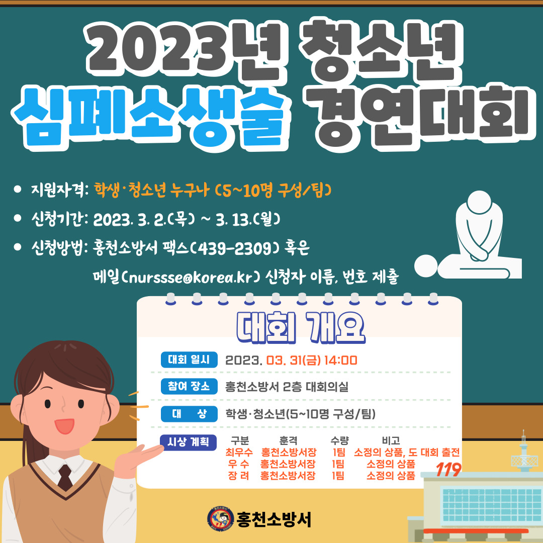 | 985 | 2023년 청소년 심폐소생술 경연대회 참가자 모집 | 홍천홍보 | 2023-03-02 | 740 | |