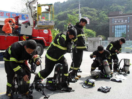 2009.10.02일 홍천소방서에서 신규자(유동근 외 14명)들은 공기호흡기 착용훈련 및 장비조작훈련을 실시하였습니다.