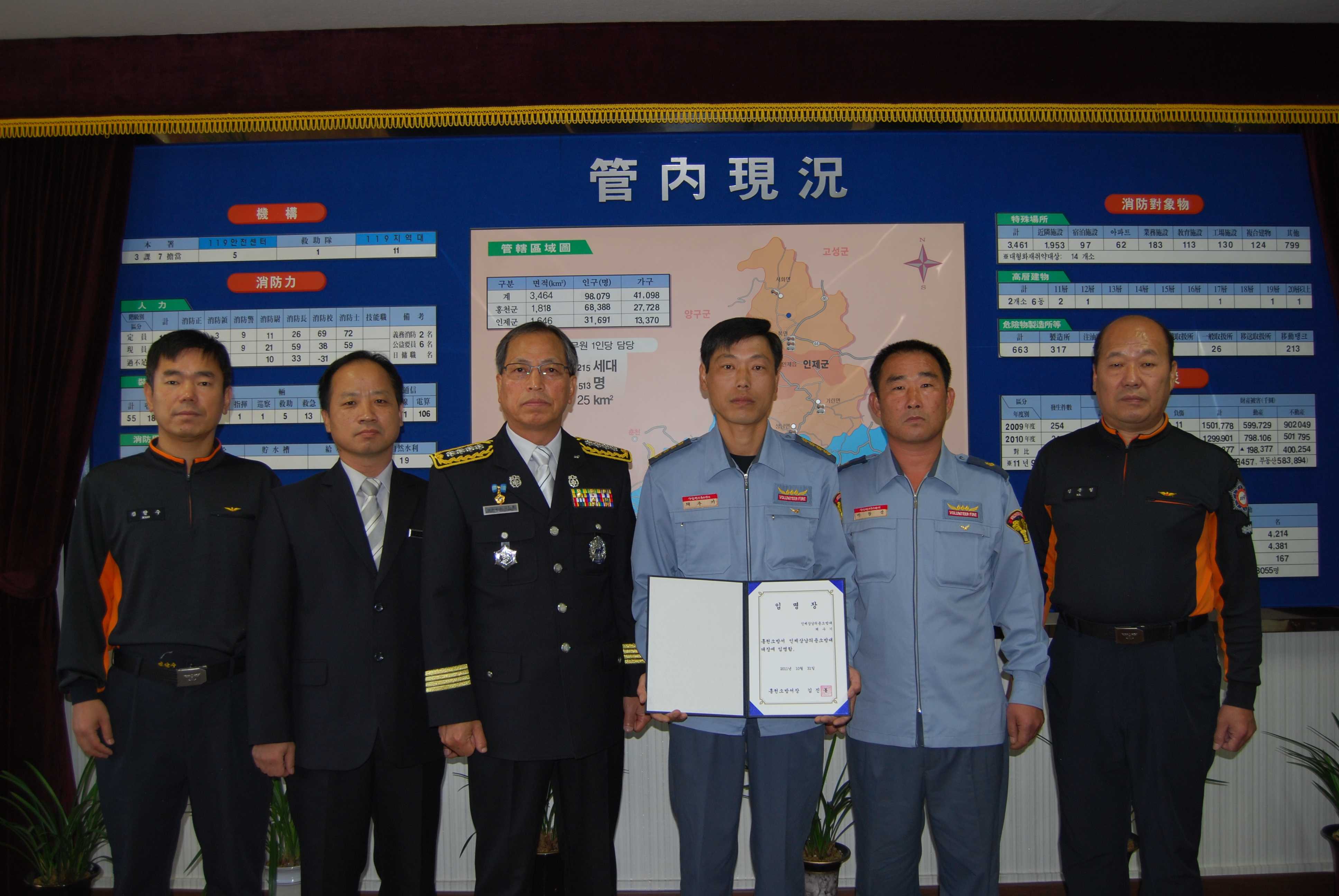 홍천소방서(서장 : 김진봉)에서는 10월 31일(월) 신임 인제상남의용소방대장 임명장 수여식을 가졌다. 신임 채수기 대장은 서무반장, 총무부장을 역임하였으며, 평소 화재 및 각종 구조구급현장에 신속하게 출동하여 소방활동에 헌신적으로 봉사한 인물이며, 다양한 봉사활동에 참여하여 지역주민들의 칭송이 자자한 인물로 알려져 있다.