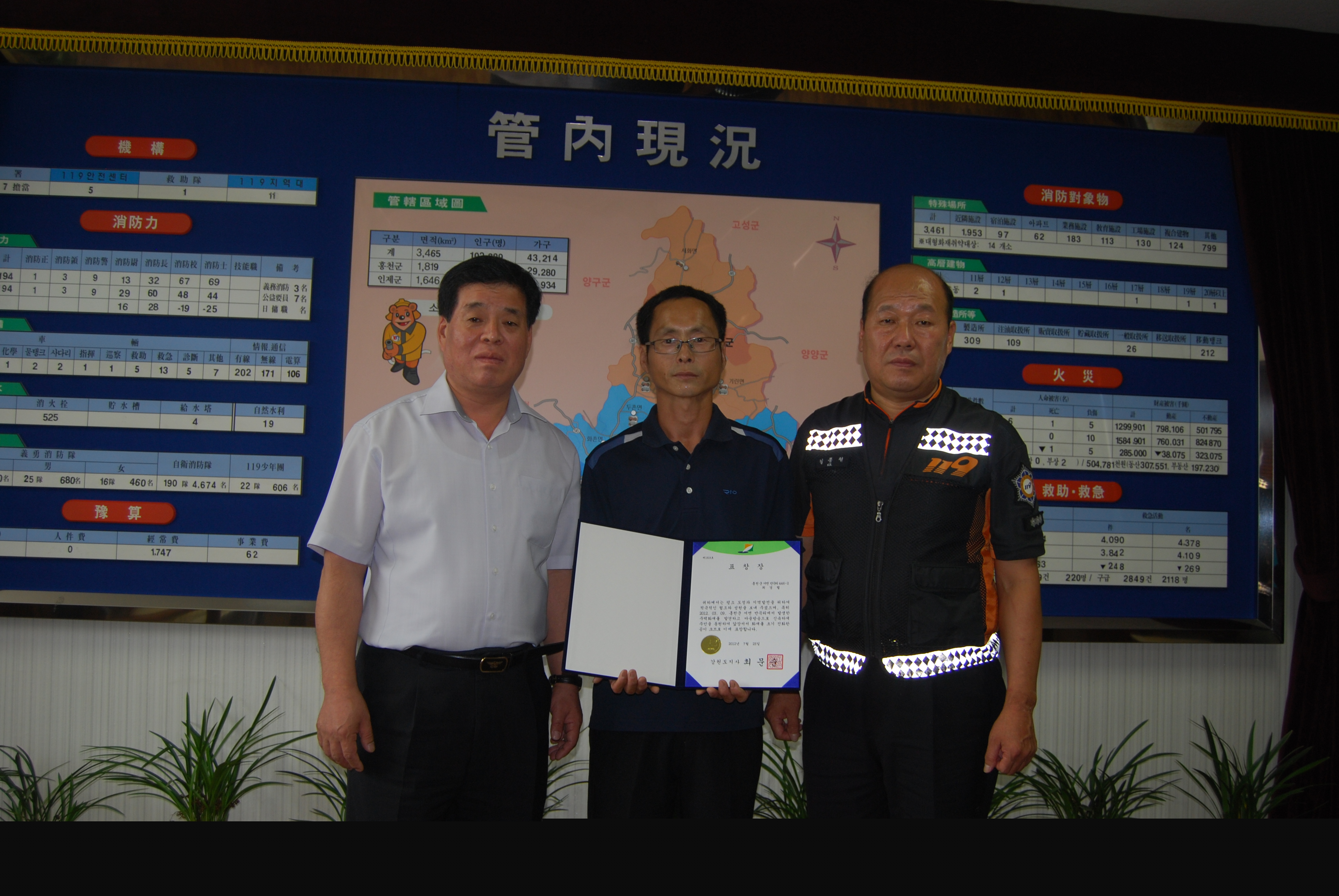 홍천소방서(서장 이종진)는 지난 3월9일 서면 반곡리 주택 화재발생시 소방대 도착전 신속정확한 초기대응으로 인명과 재산피해를 방지한 서면 의용소방대원 최경렬(남/44)대원에게 도지사 표창을 전수했다.