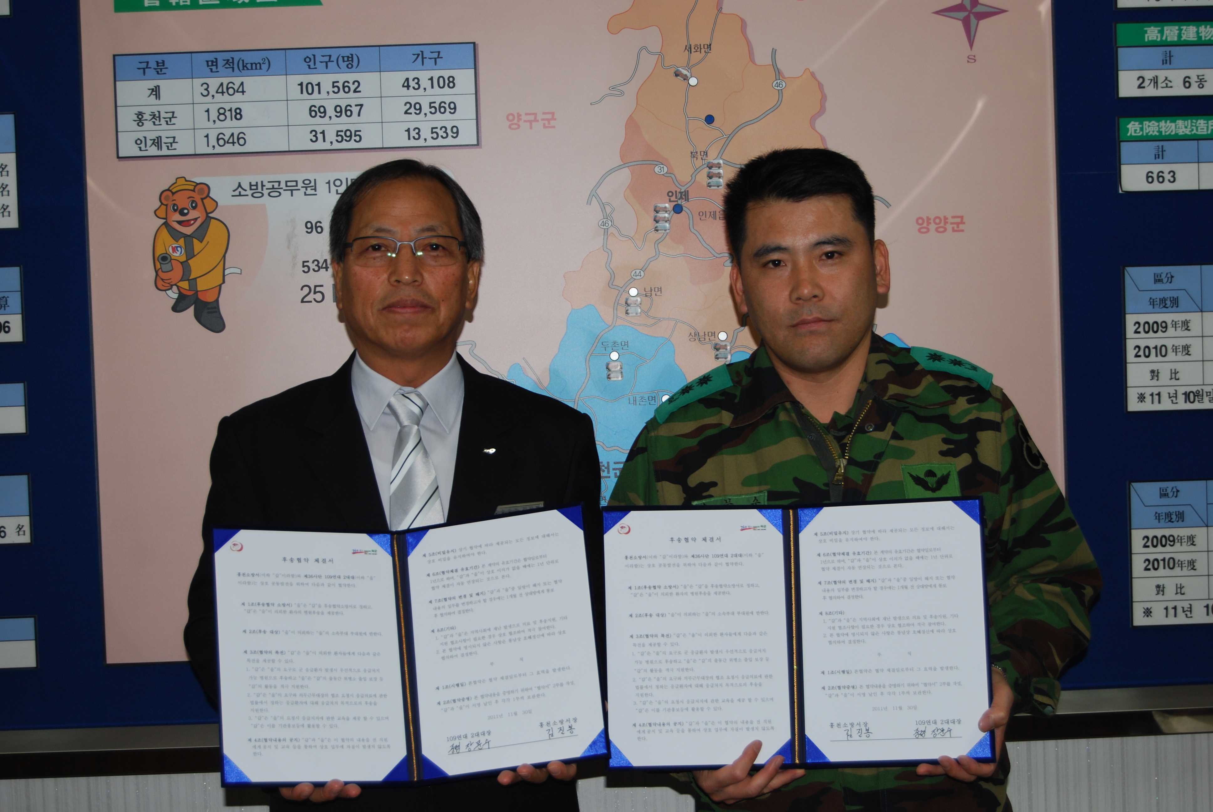 홍천소방서(서장 김진봉)는 11월30일 오전 10시 본서 서장실에서 36사단 109연대 2대대(대대장 중령 장문수)와 응급환자 후송협약을 맺었다.