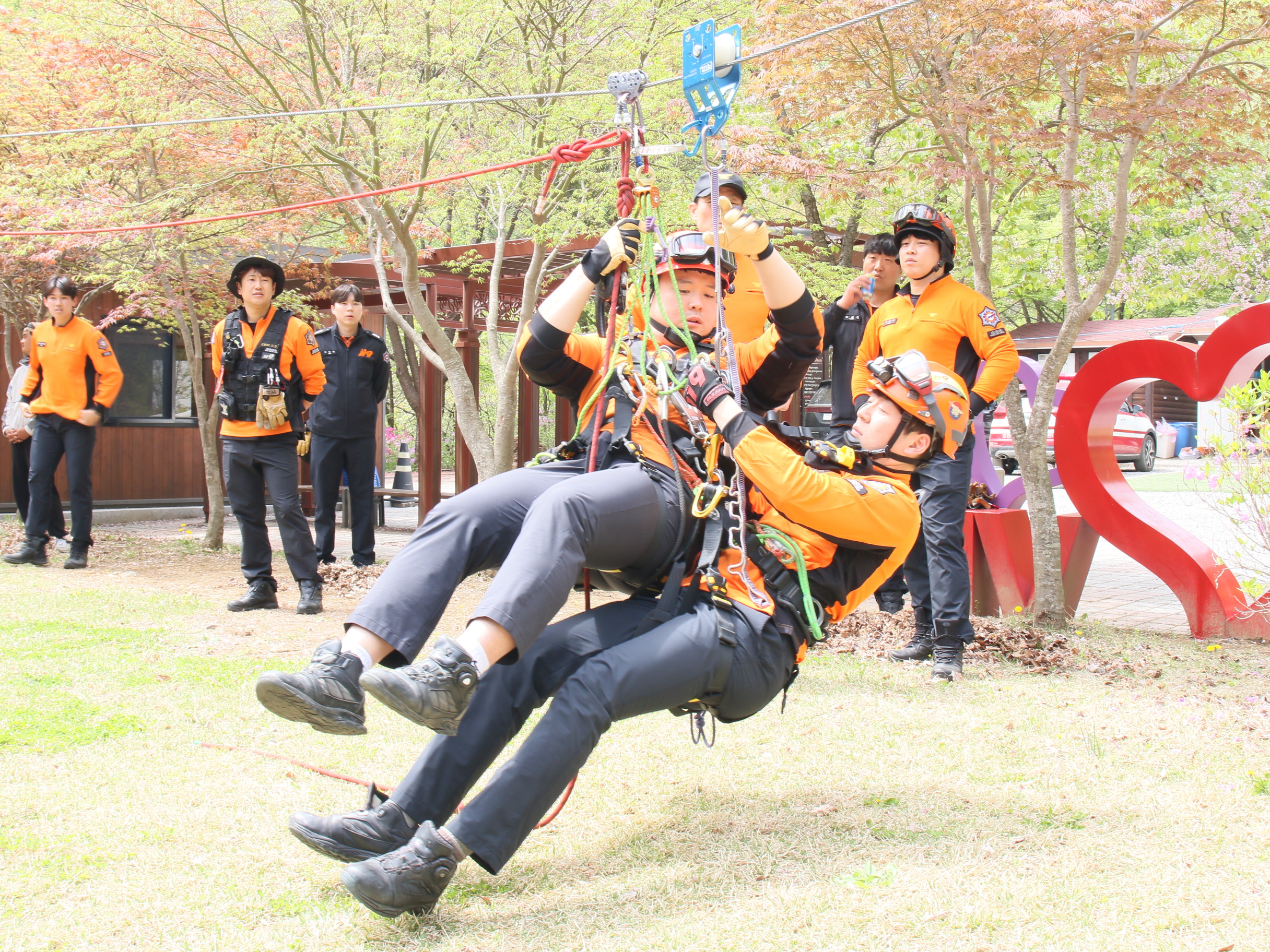 이번 훈련은 ▲짚라인 사고(중간멈춤) 발생 시 대비 인명구조 훈련 ▲업체 보유장비 활용 구조방법 및 대응매뉴얼 훈련 ▲구조대 구조장비 활용 구조기법 훈련 등으로 진행됐다.
