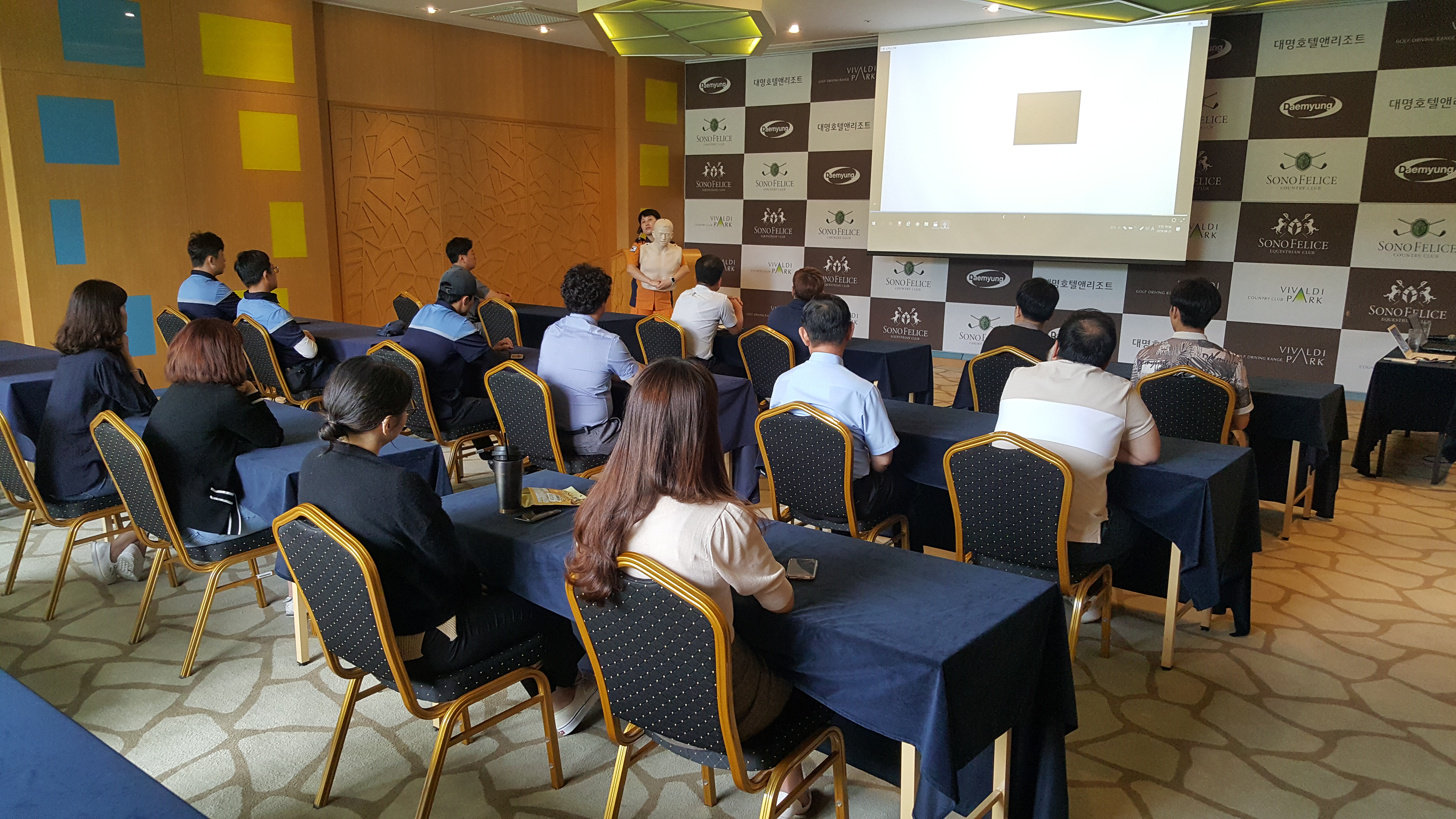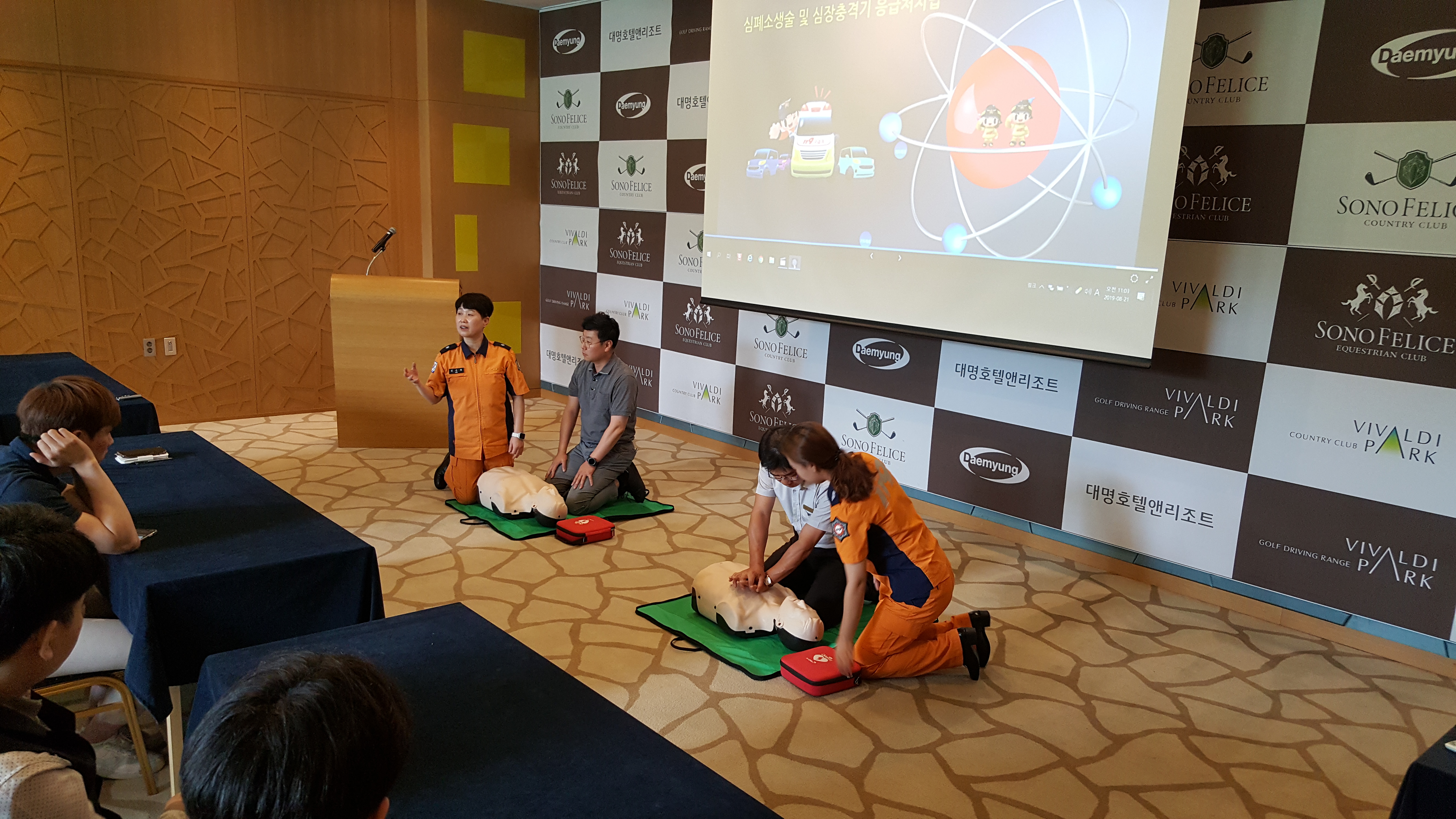 최근 심장질환 고위험군에 속하는 중장년층 골프 인구 급증으로 인한 심정지 사고들이 빈번이 일어나 저희 비발디파크에서도 위험을 인지하고 홍천소방서에 심폐소생술 및 심장충격기 교육을 요청하여 진행하였습니다.