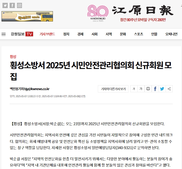 □ 횡성소방서(서장 박순걸)는 2025.05.01.~05.23. 3주간 2025년 횡성소방서 시민안전관리협의회 신규회원 모집중이다.