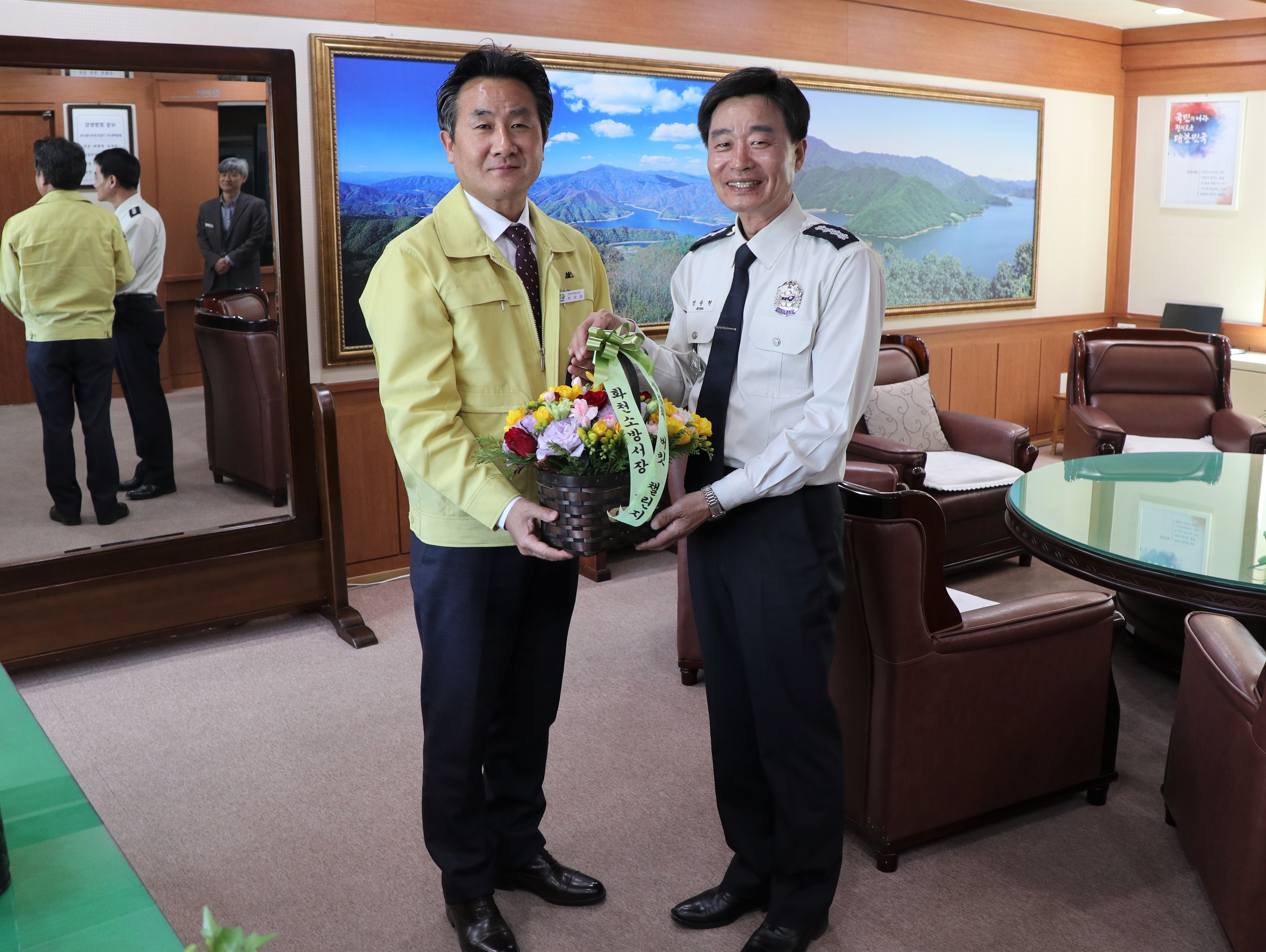 화천경찰서장과 화천수력발전소장에게 꽃바구니를 전달했다.