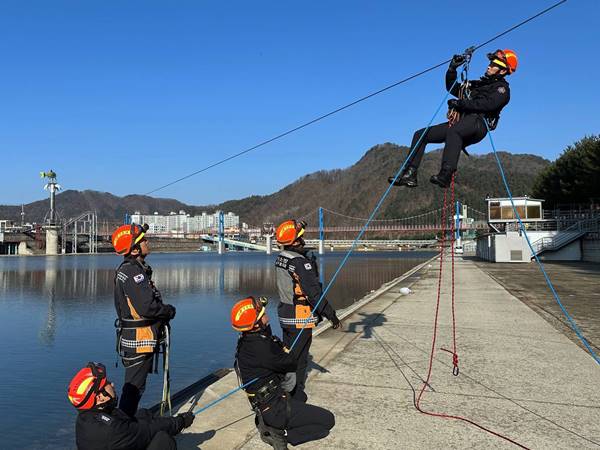 이날 훈련은 화천 산천어축제시 운영하는 하늘가르기 집라인 운행 중 발생 가능한 사고에 대비하여 선제적으로 대국민 안전에 만전을 기하고자 추진됐다.