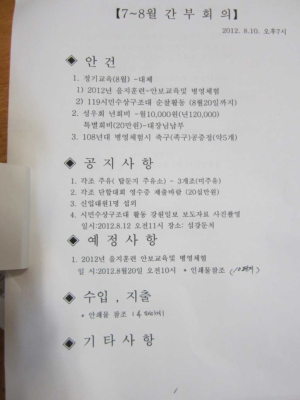 횡성의소대 8월 간부회의 모습-안건및의결사항 기타토의-공지사항