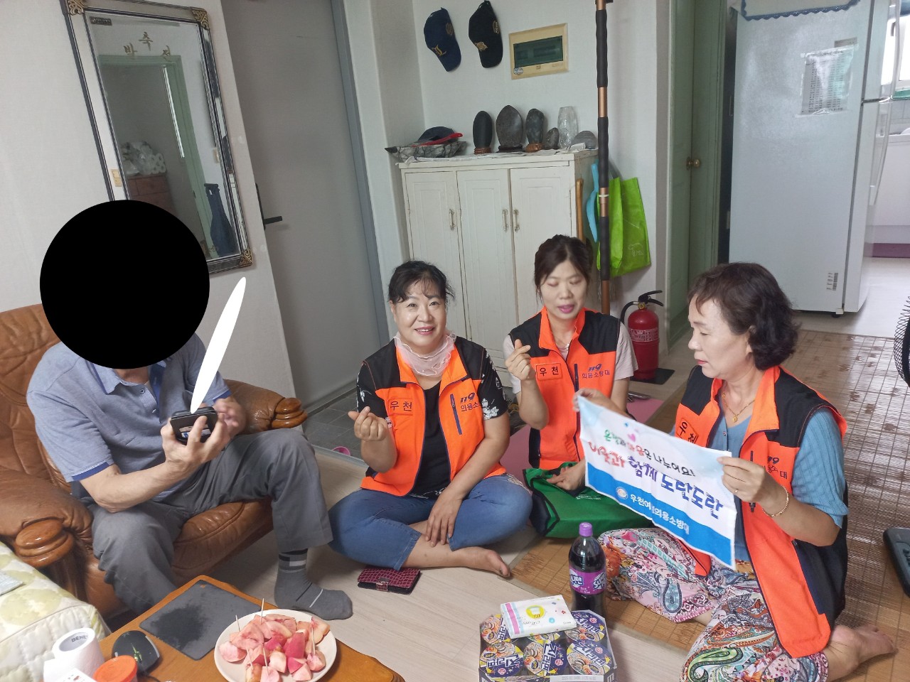 8월 9일 9시부터 우천여성의용소방대원들은 두 가정을 방문하여 이야기 꽃도 피우고 물품도 잘 전달하였습니다.