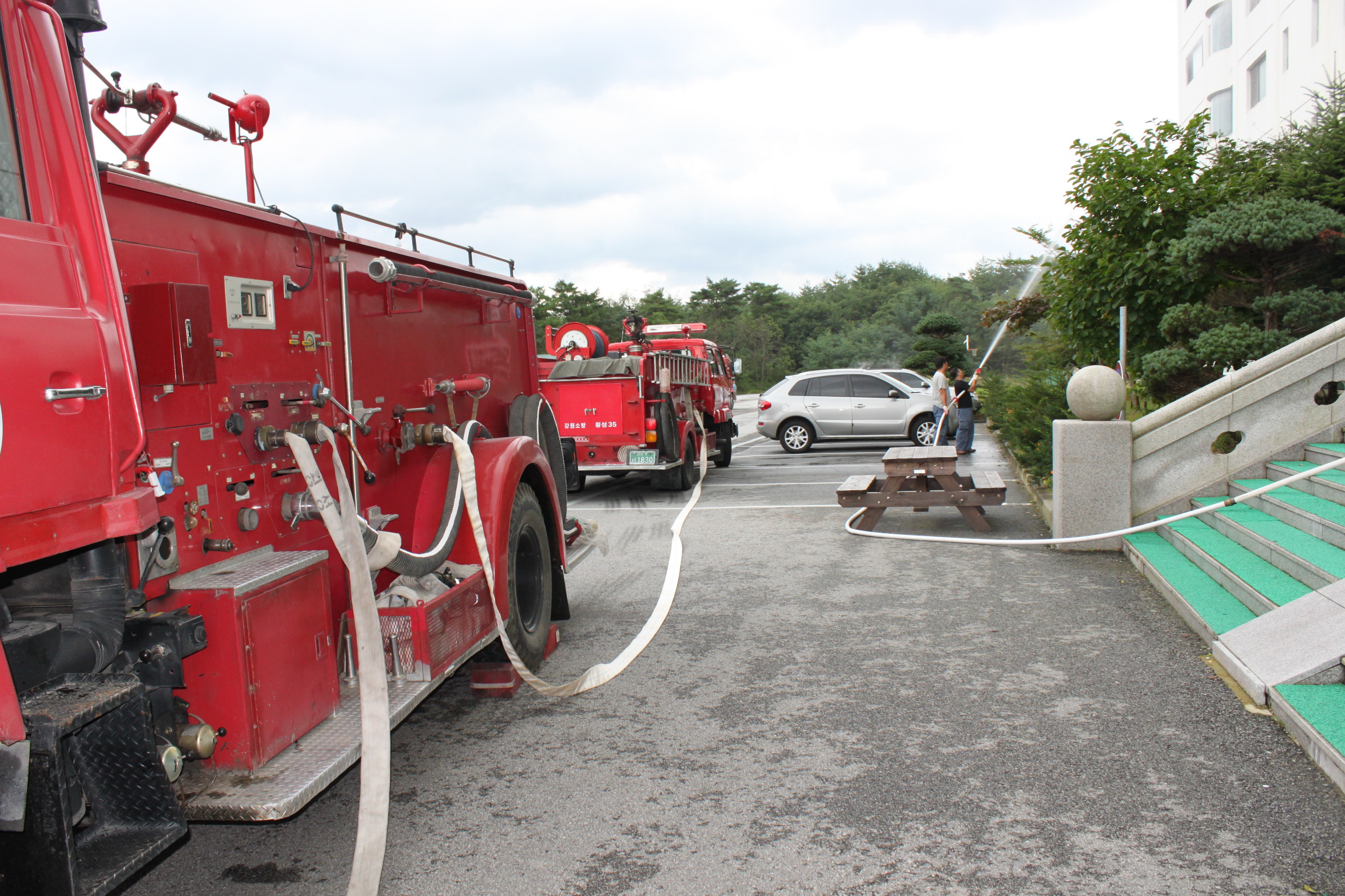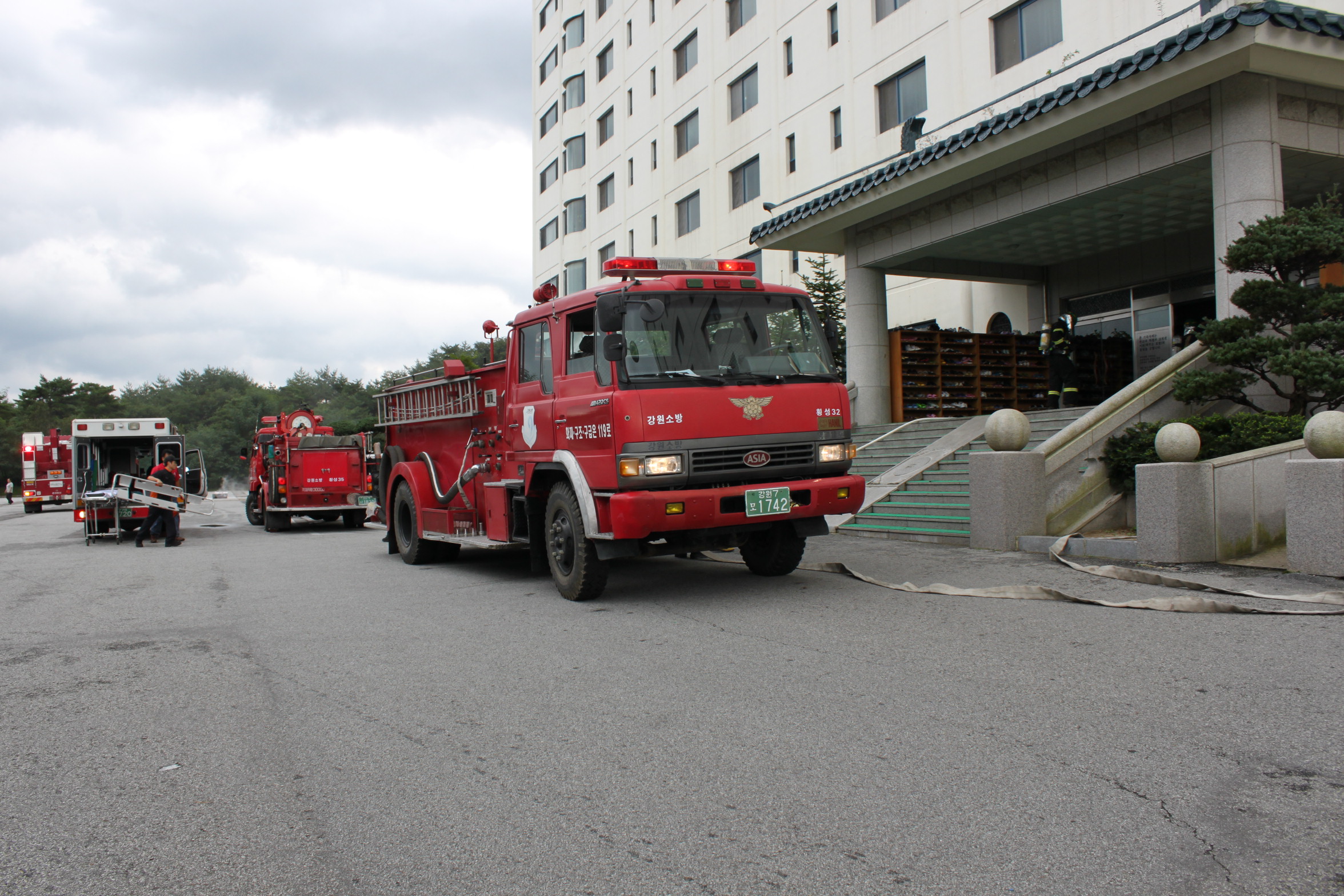 횡성소방서(서장 조근희) 현장지휘대에서는 본서주관으로 대형화재취약대상 민족사관고등학교(기숙사) 합동소방훈련을 실시하였습니다. 우천안전센터,둔내안전센터,안흥지역대,119구조대 등 4개부서 차량 5대, 인원 12명 자위소방대 30명 등 임무를 부여하여 화재진압 및 인명구조활동을 전개하였습니다. 훈련종료후에는 관계자를 포함한 교직원들을 대상으로 소화기 및 소방기본상식 교육을 실시하였고 실제 화재발생을 재연, 직접 소화기를 사용하여 불을 진화하는 등 화재진압에 높은 관심을 보였습니다. 앞으로 소방안전교육을 병행하여 질높은 소방훈련이 될 수 있도록 노력하겠습니다.