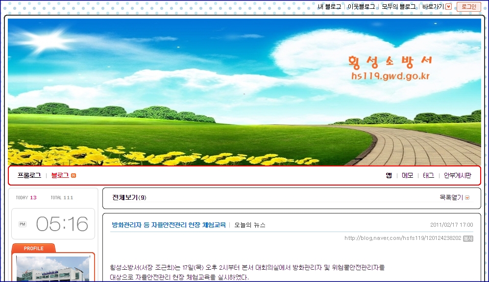 횡성소방서(서장 조근희)는 소방활동 등 홍보영역을 넓히기 위해 블로그를 오픈하였습니다.