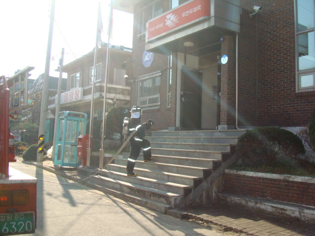 횡성소방서(서장 조근희) 우천119안전센터에서는2011.11.03 우천면 우항리에 위치한 우천우체국 공공기관합동훈련을 실시하였습니다. 비록 우천안전센터와 정면을 바라보고 있는 가까운 위치이지만 화재진압훈련 및 관계자와 직원을 대상으로 화재시 초기진화방법과 피난 대피요령등을 실전과 같이 교육하였습니다.