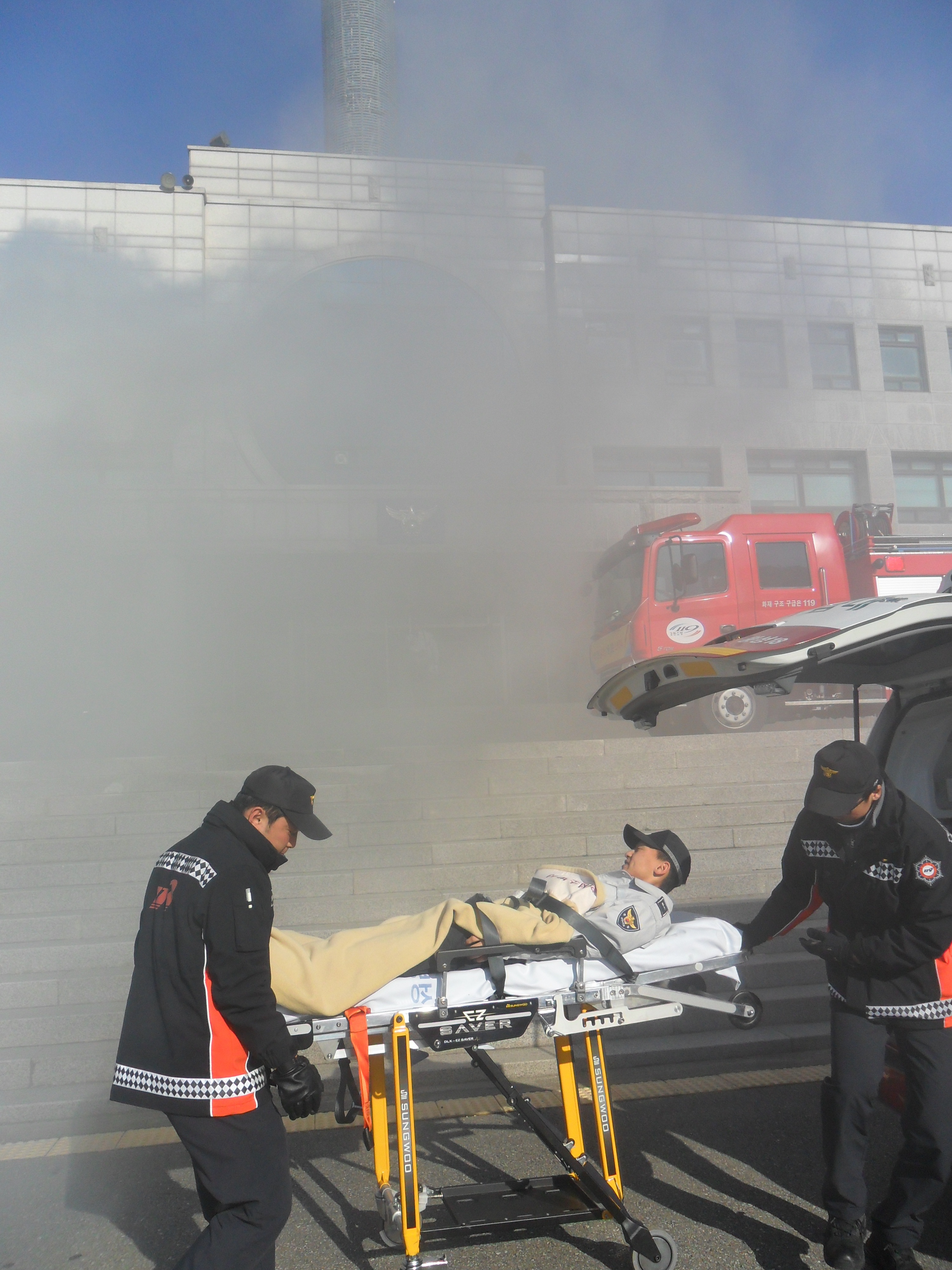 실제 화재가 난 것처럼 일사분란하고 신속하게 출동하여 방수하고 가상의 환자를 이송한뒤 겨울철 화재를 대비한 소방안전교육을 실시하였습니다.