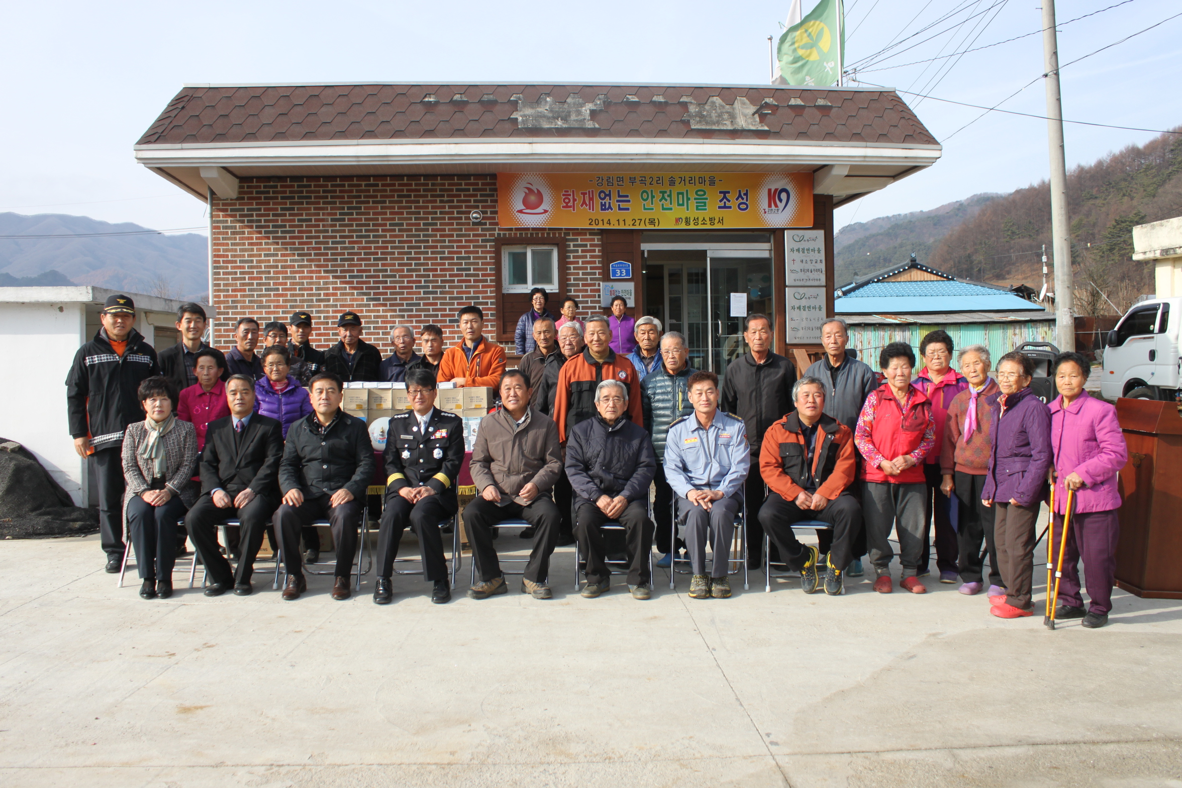 횡성소방서(서장 이병은)는 27일 11시 횡성 강림면 부곡2리 솔거리 마을회관에서 관내 기관단체장 및 마을주민 40여명이 참석한 가운데 제9차 화재없는 안전마을 조성식을 가졌다.