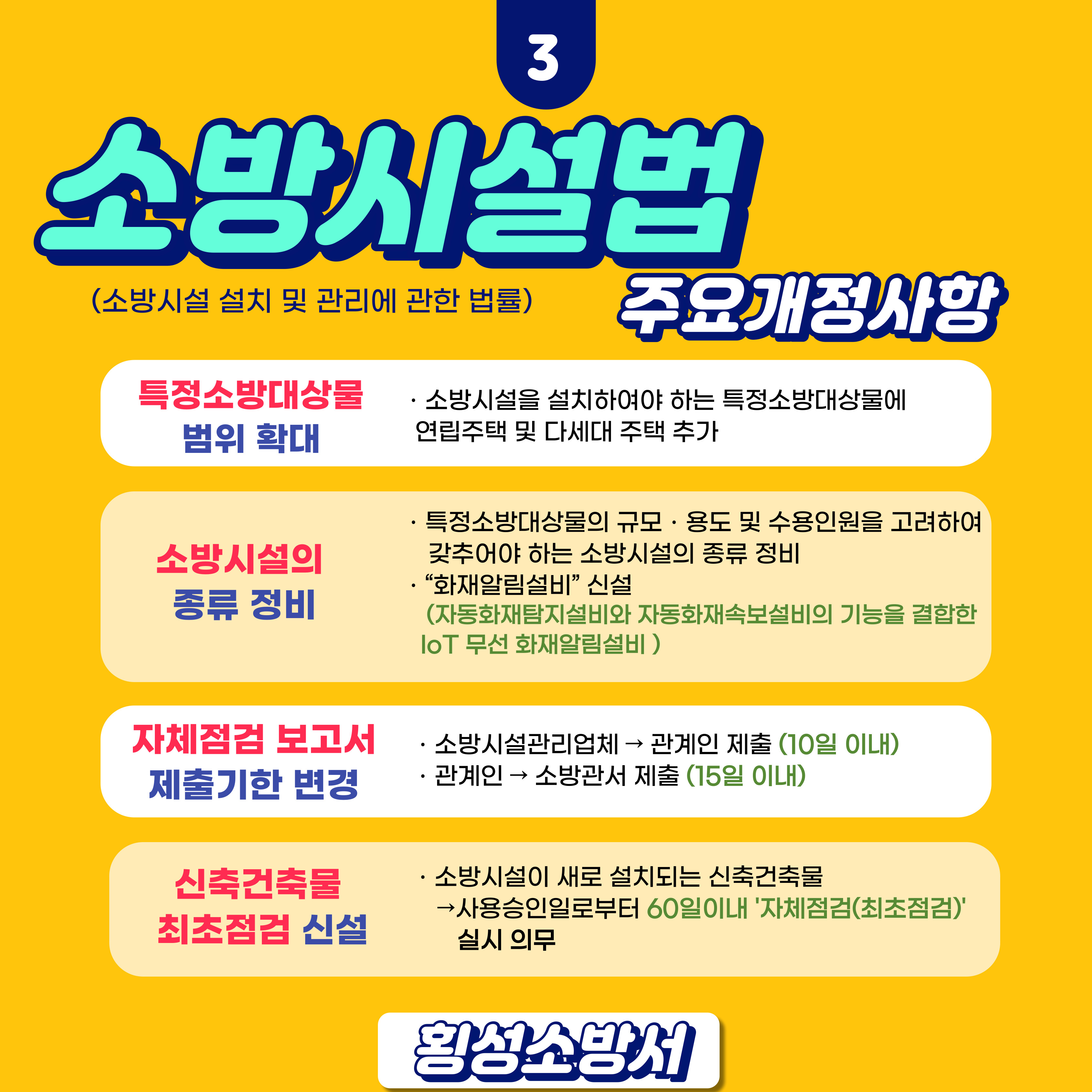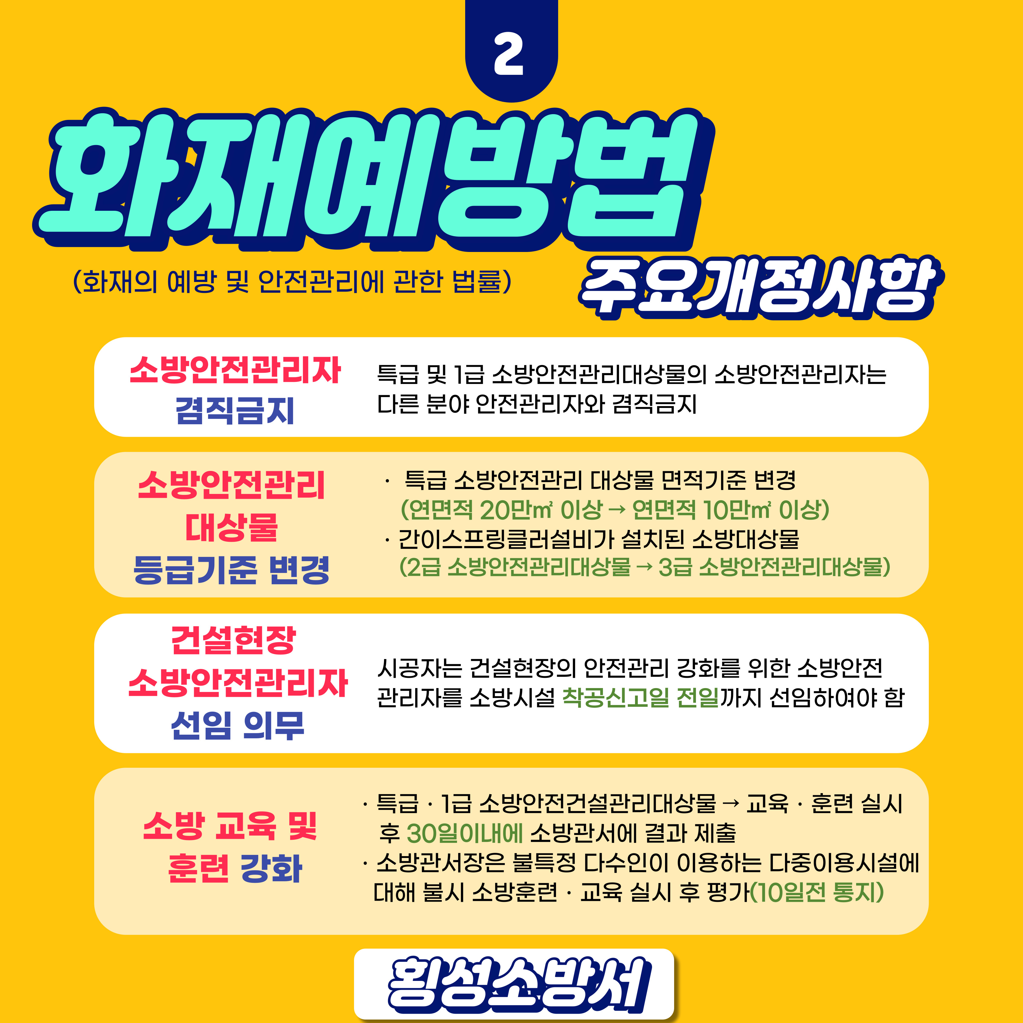 하지만 아직, 변경된 소방법령을 인지하지 못하여 업무처리에 혼선을 가지고 계신 관계자분들이 많아 주요사항을 정리하여 카드뉴스로 제작하였습니다!!