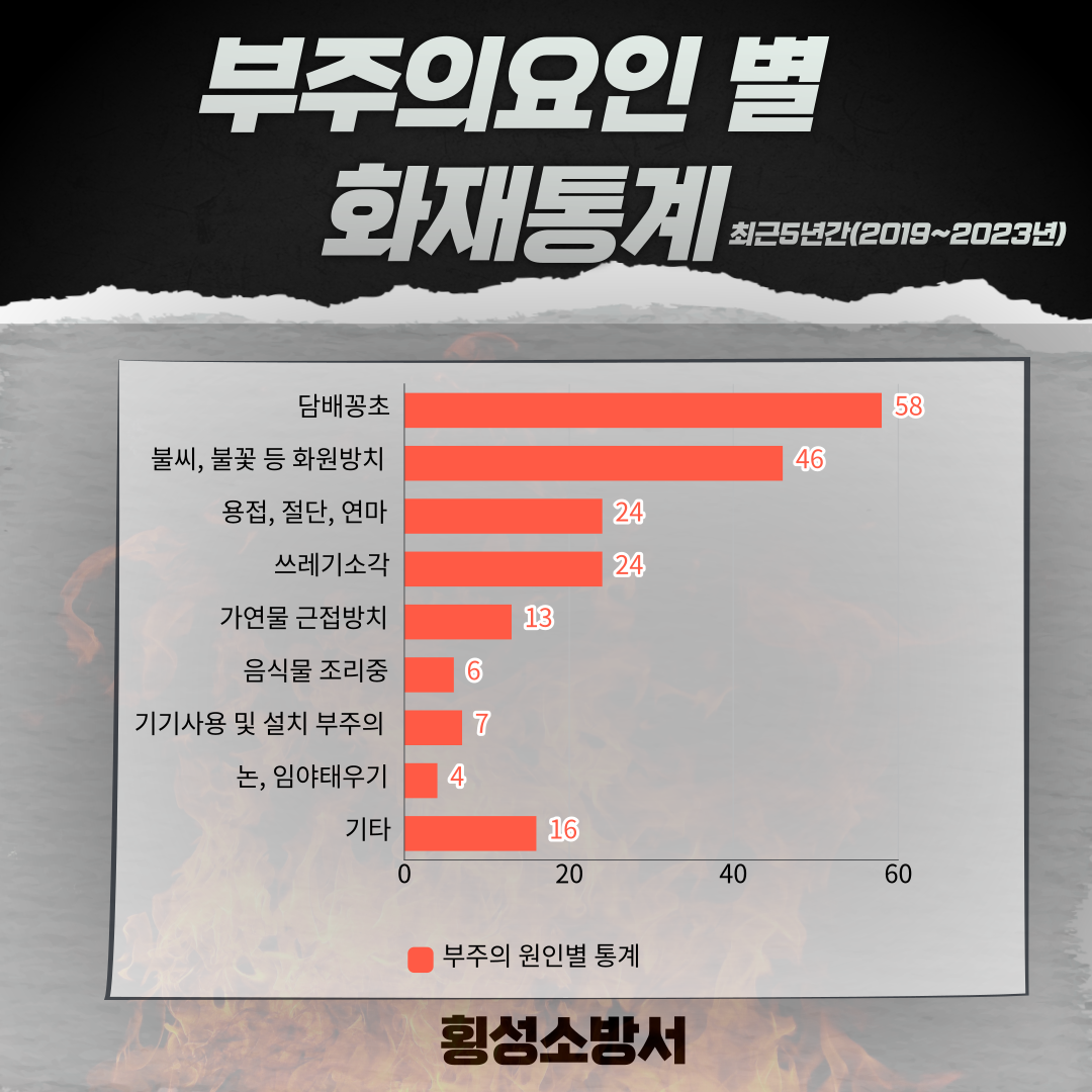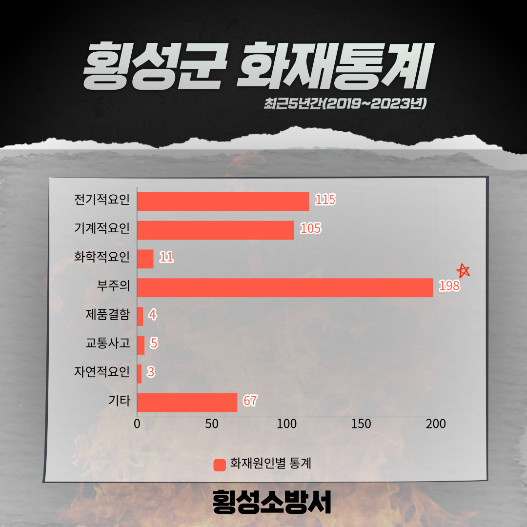 최근 5년간(2019년~2023년) 횡성관내 발생한 화재원인 중 가장 높은 요인이 부.주.의.로 인한 화재로 나타났습니다.