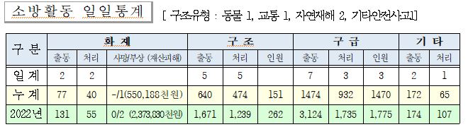 ○ 구조 5건(동물 1, 교통사고 1, 자연재해 2, 기타안전사고 1)