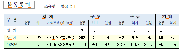 □ 소방활동실적 ○ 구조 3건(시건개방1, 벌집제거 2) ○ 구급 4건(이송 6 ) |