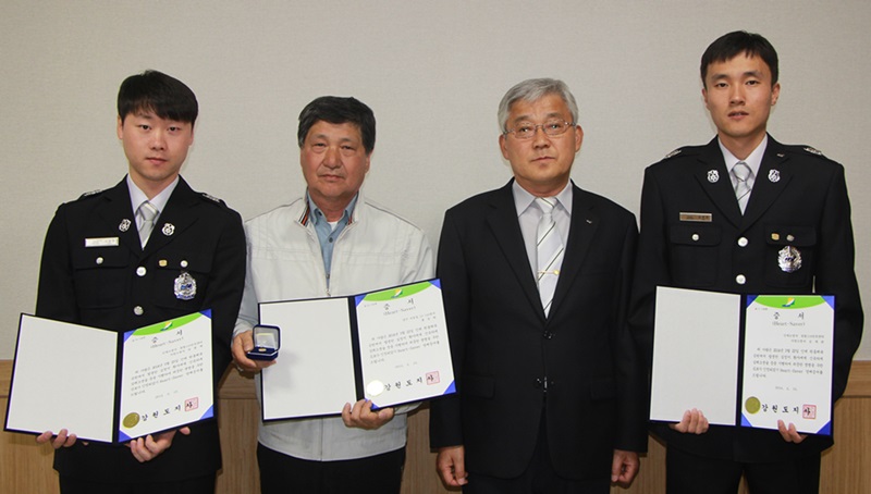 (원통센터 소방사 차봉택,심재관)과 일반인(홍승화)에게 하트세이버 증서와 배지를 수여하였습니다.