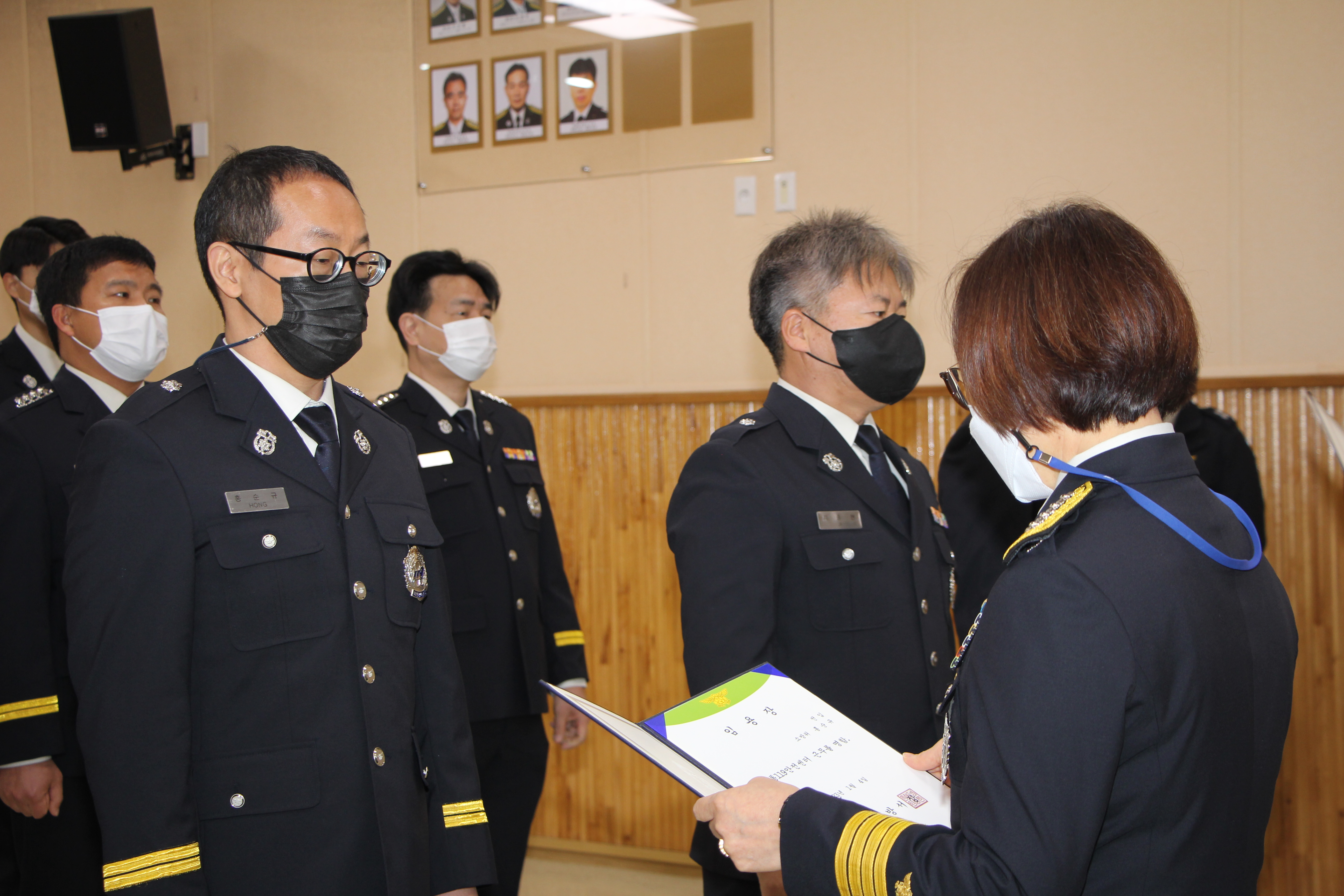 ○ 김정희 인제소방서장은 임명장 수여와 동시에 직원 한 명 한 명과 인사를 나누며 새로운 직원들에게는 격려를, 승진자들에게는 축하를 건넸다.
