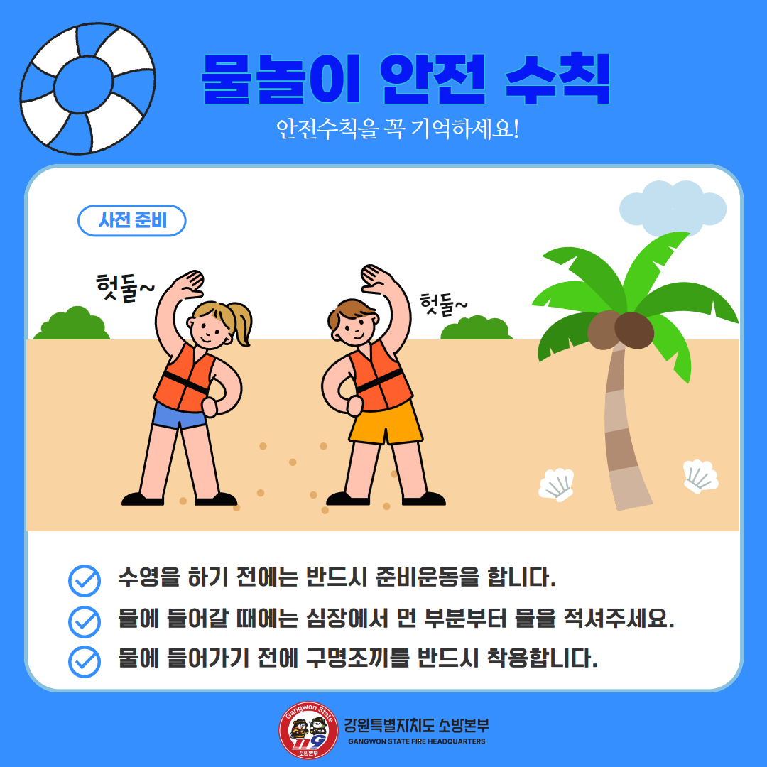 ▲물놀이 전 준비운동 필수 ▲구명조끼, 튜브 등 안전장비 착용 ▲수심이 깊은 곳, 유속이 빠른 곳, 물놀이 금지구역 등 입수 금지 ▲음주 후 물놀이 금지 ▲사고 목격 시 신속한 119신고 등입니다.