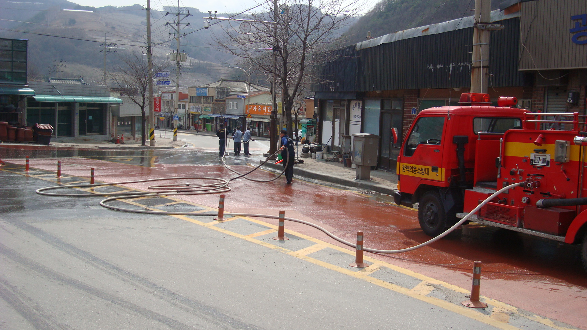 지저분한 거리를 물로 깨끗히 청소하는 함백의소대~~