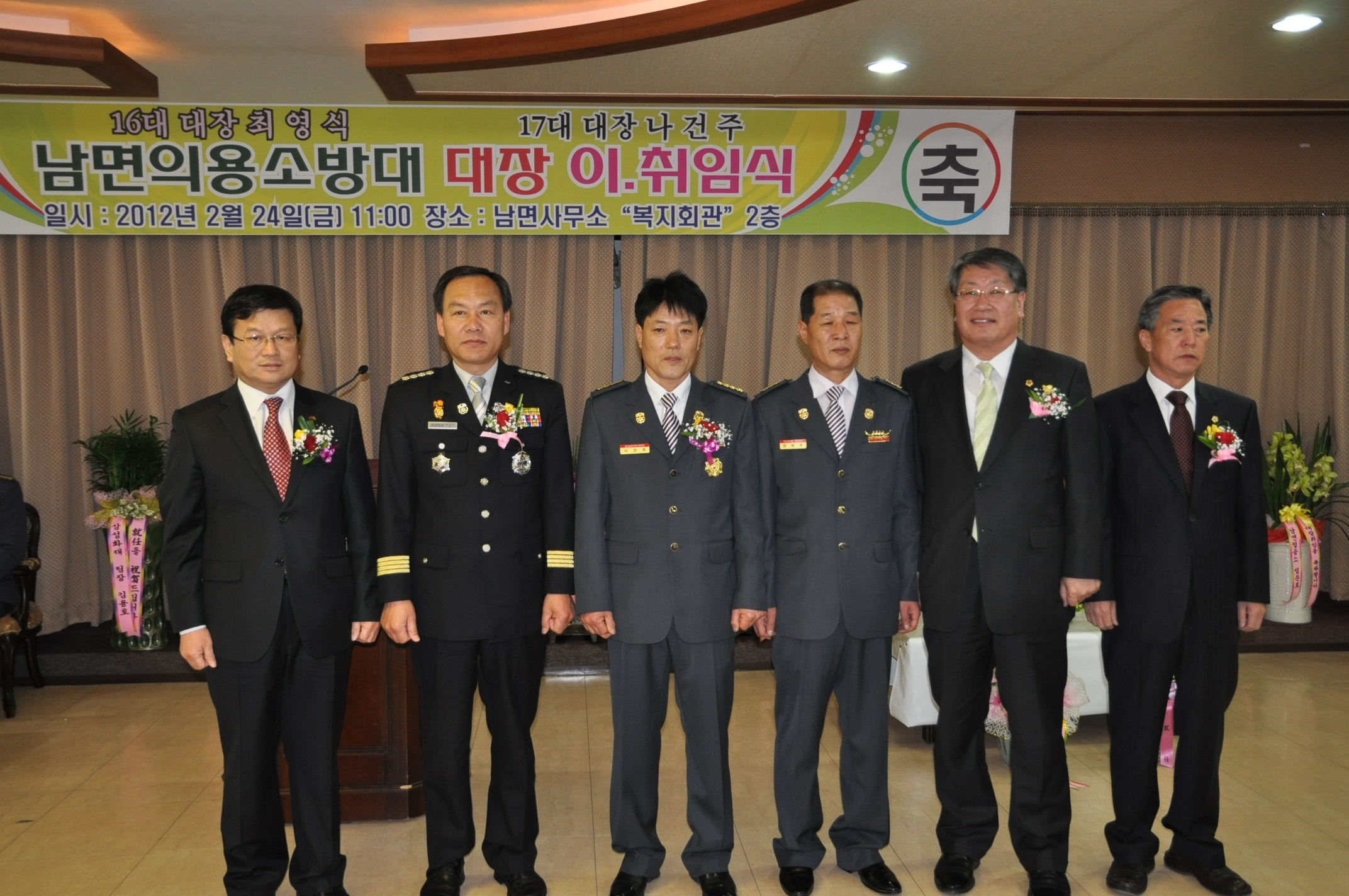 정선군 남면의용소방대장 이.취임식이 24일 오전 11시 남면복지회관에서 관내 기관 단체장과 의용소방대원 등 150여명이 참석한 가운데 개최돼 제16대 최영식 대장이 이임하고, 제17대 나건주 대장이 취임했다.