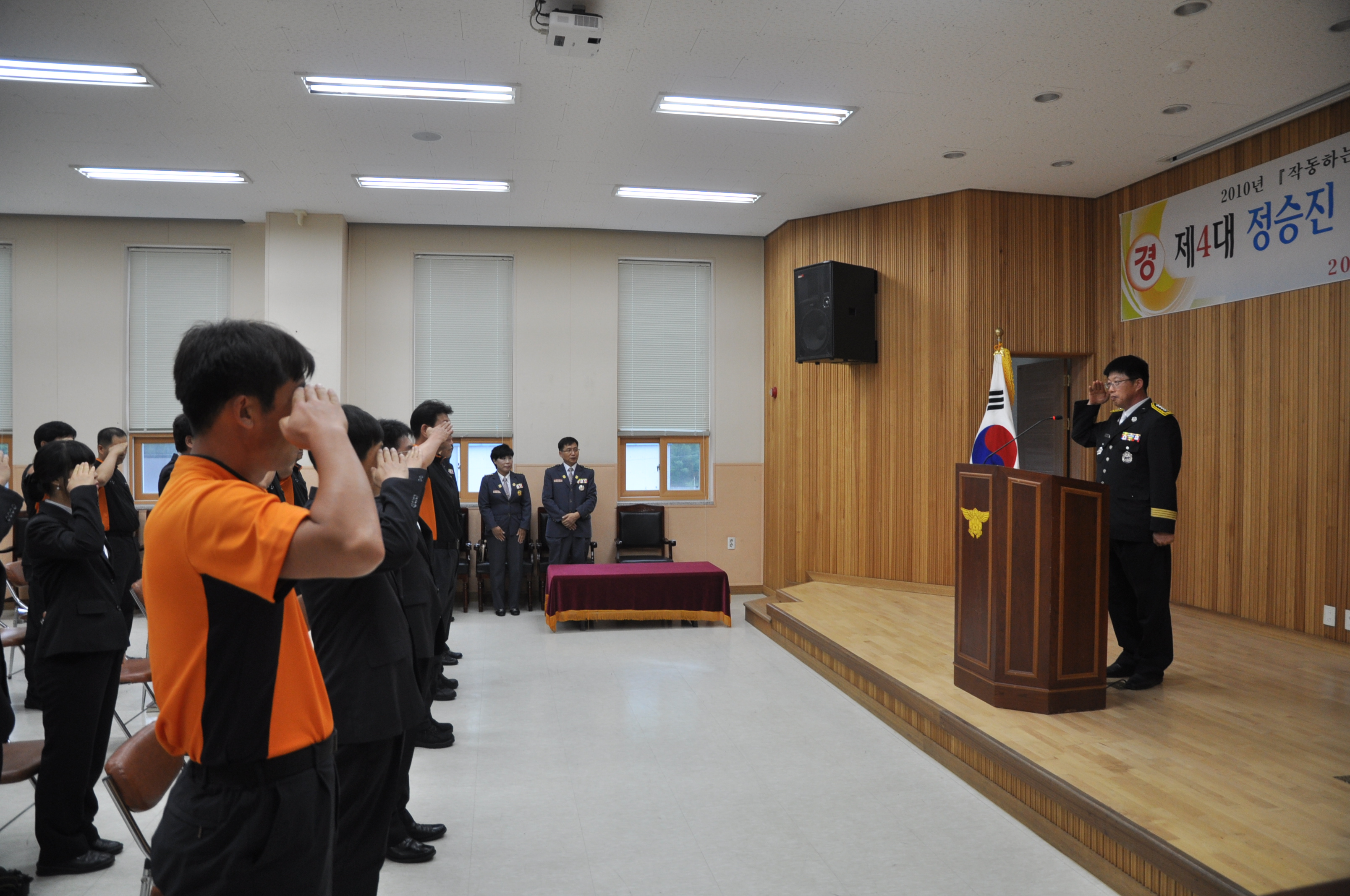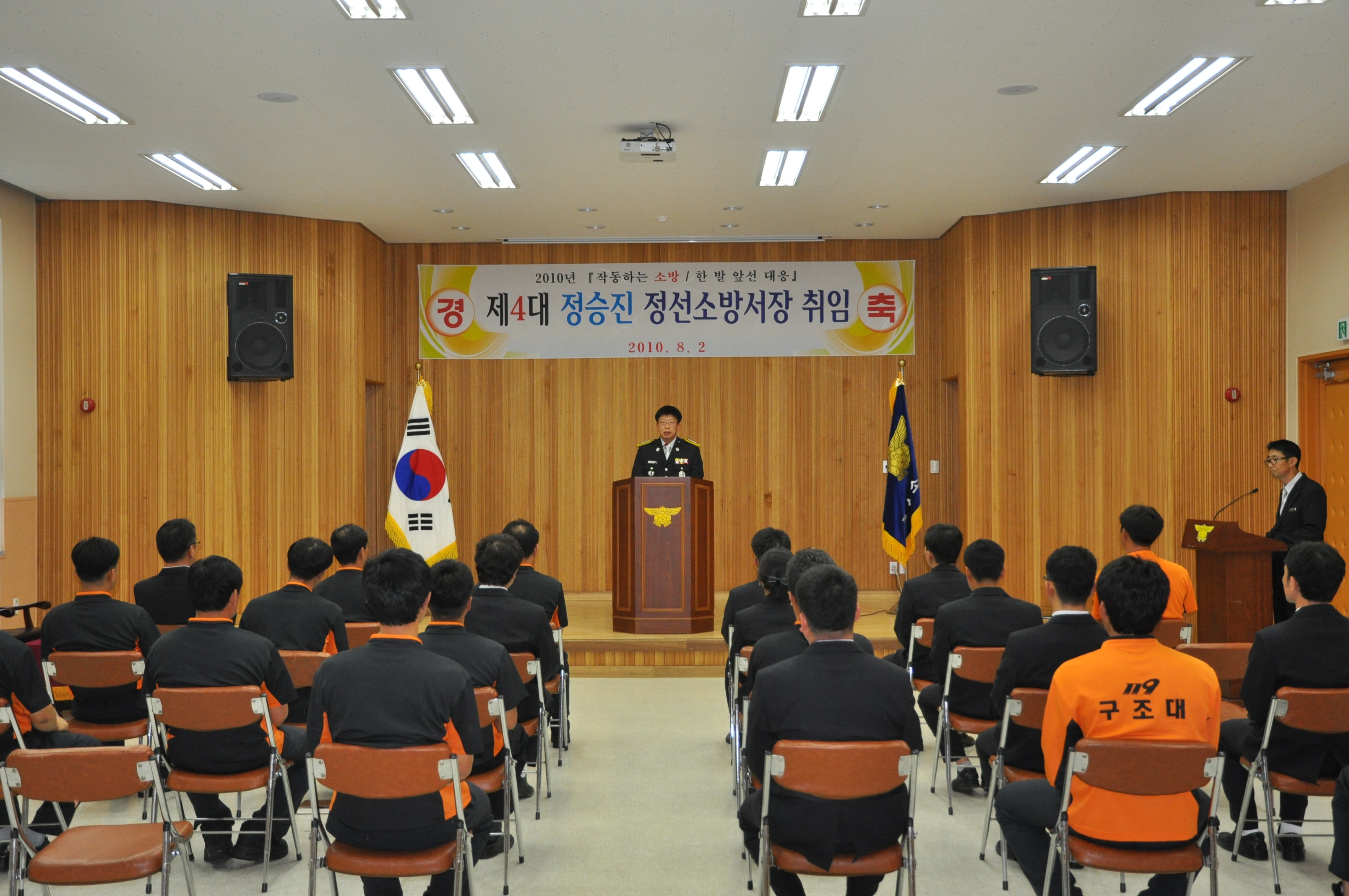 2010.08.02.(월요일) 정선소방서(서장 정승진)에 새로운 안전 지휘관이 부임하였다. 취임식에서 관광중심지로 우뚝선 정선! 수많은 관광인파로~ 소방을 필요로 하는 일이 많아 지면서... 최상의 소방서비스를 위해 노력하라는 당부말씀이 있으셨다.