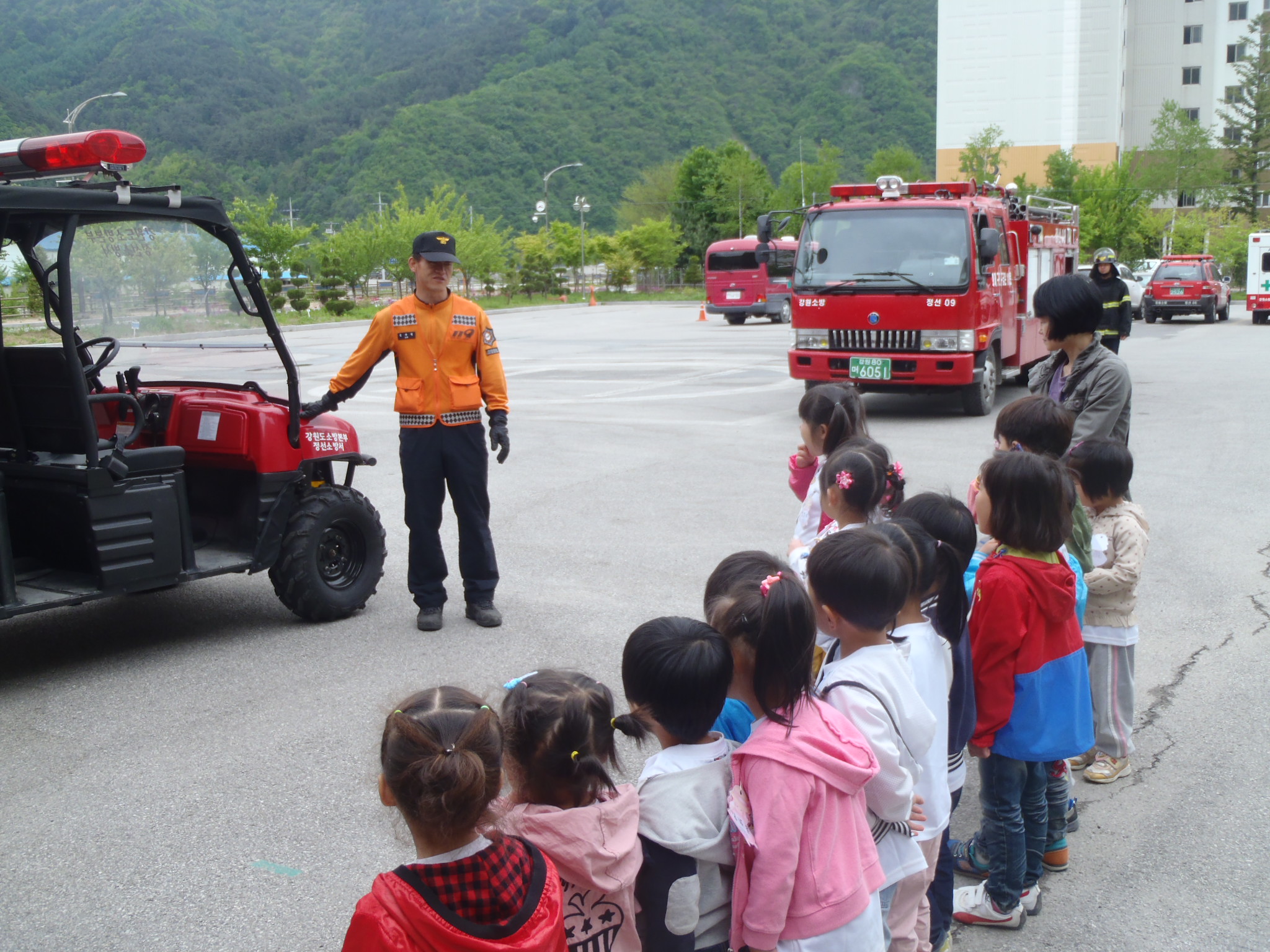 정선소방서(서장 박창진) 119구조대는 05.11. 14시부터 정선관내 고한 어린이집 어린이들을 맞아 소방교육을 실시 했습니다. 이번 교육은 기본적인 소화기 사용방법과 장난 전화 및 불장난 예방에 중점을 두었으며 어린이들에게 소방관 아저씨들이 어떤 일들을 하고 있는지에 대해 자세히 설명도 해주었답니다. 너무나도 이쁘고 깜찍한 새싹들과 보낸 즐거운 시간 이었습니다.~