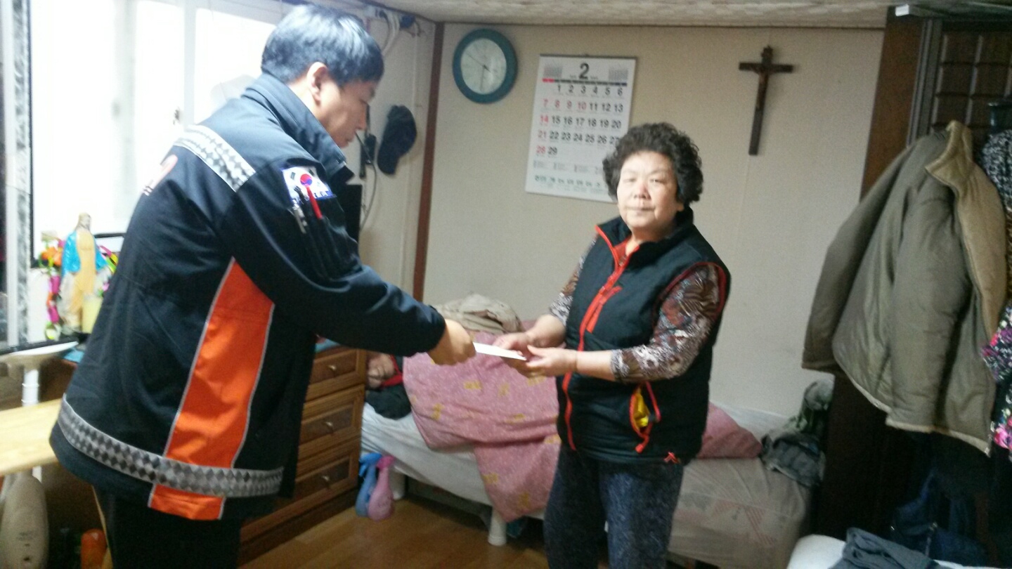 정선소방서 임계119안전센터(센터장 박명희)는 임계여성의용소방대(대장 정옥량) 대원들과 함께 설맞이 불우이웃돕기의 일환으로 관내 대상자에게 성금을 전달하였습니다. 눈물을 지으시며 감사해하시는 어르신께서 조금이라도 따뜻한 설이 되시길 바랍니다.