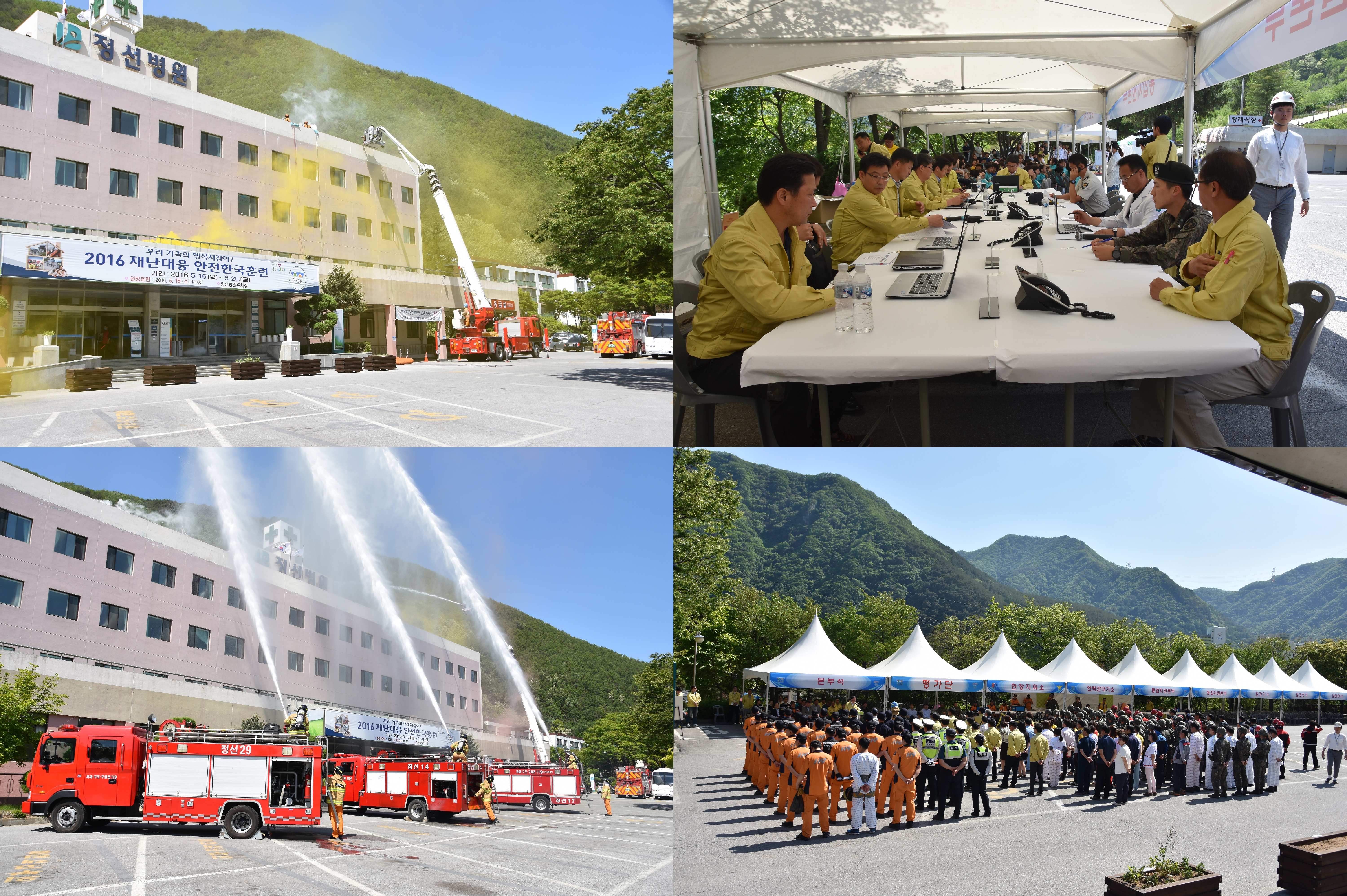 정선소방서(서장 이기중)는 2016. 05. 18 근로복지공단 정선병원 주차장에서 2016년 재난대응 안전한국훈련을 실시하였습니다.이 날 훈련은, 10여 개 유관기관과 180여 명의 인력이 동원되어 다중밀집시설 대형화재를 가정하여 진행되었습니다.